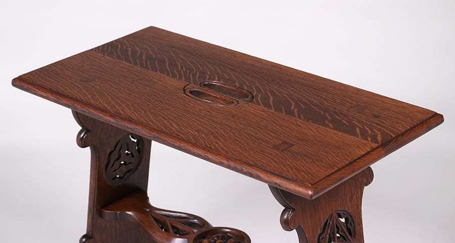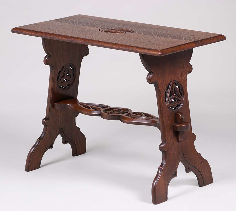 Arts & Crafts carved Gothic side table c1900 in the style of Rose Valley. Unsigned. Very nicely refinished. 28"w x 15"d x 22"h SOLD