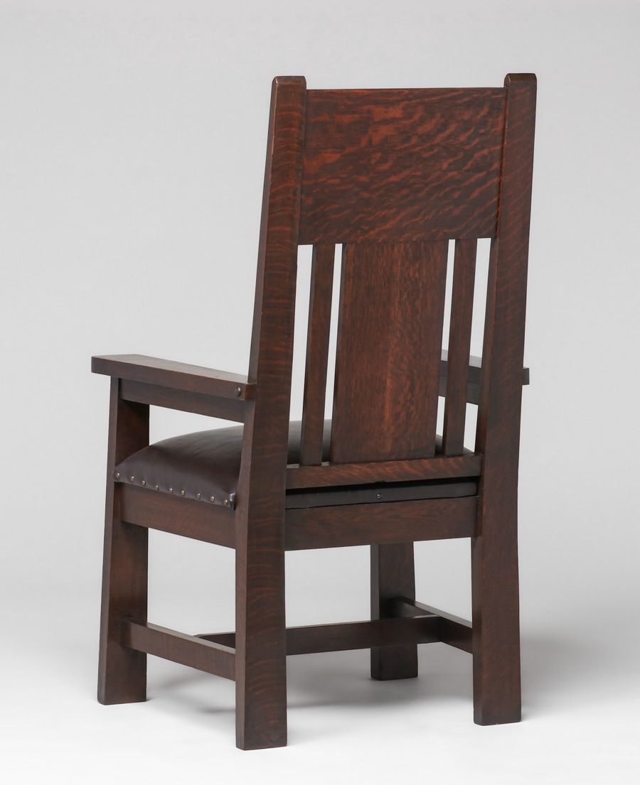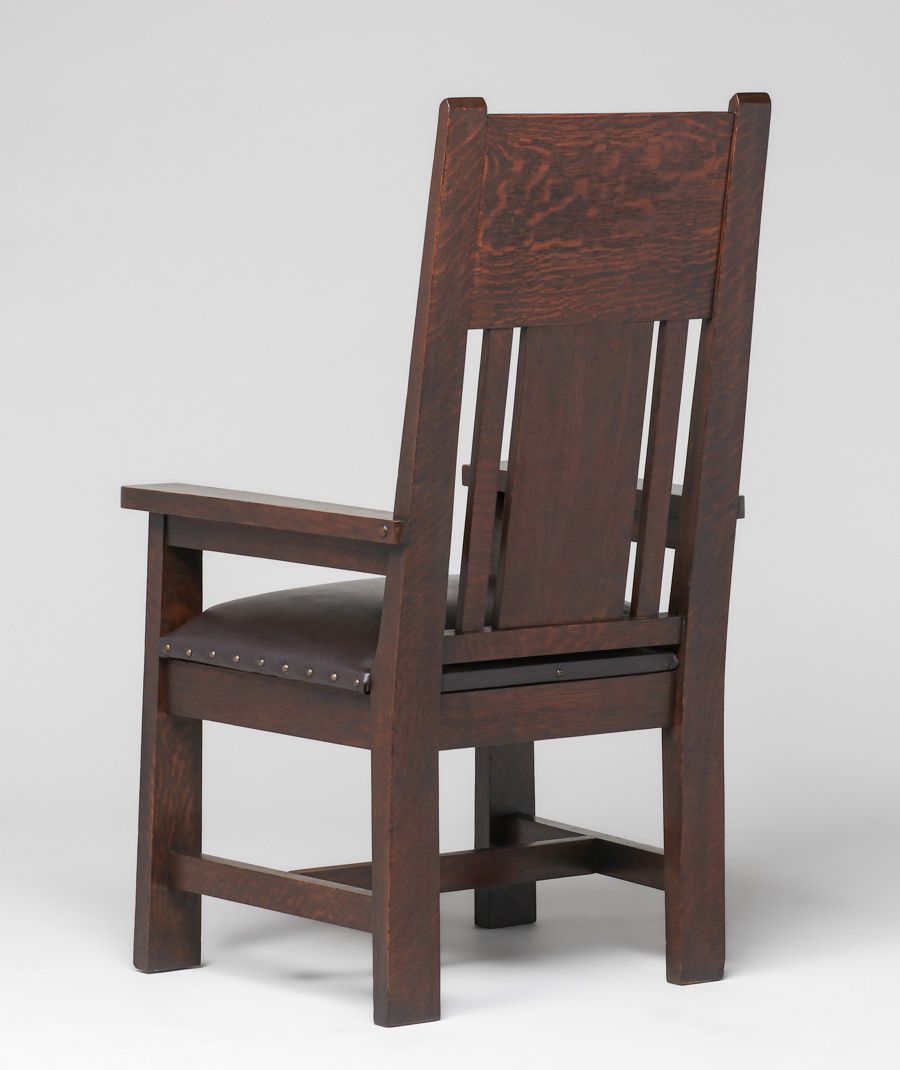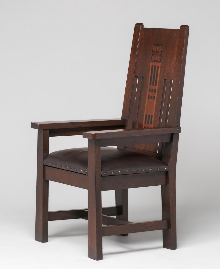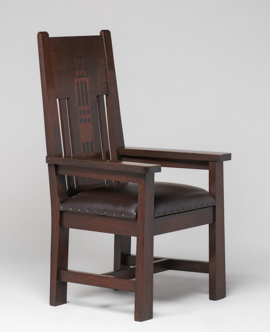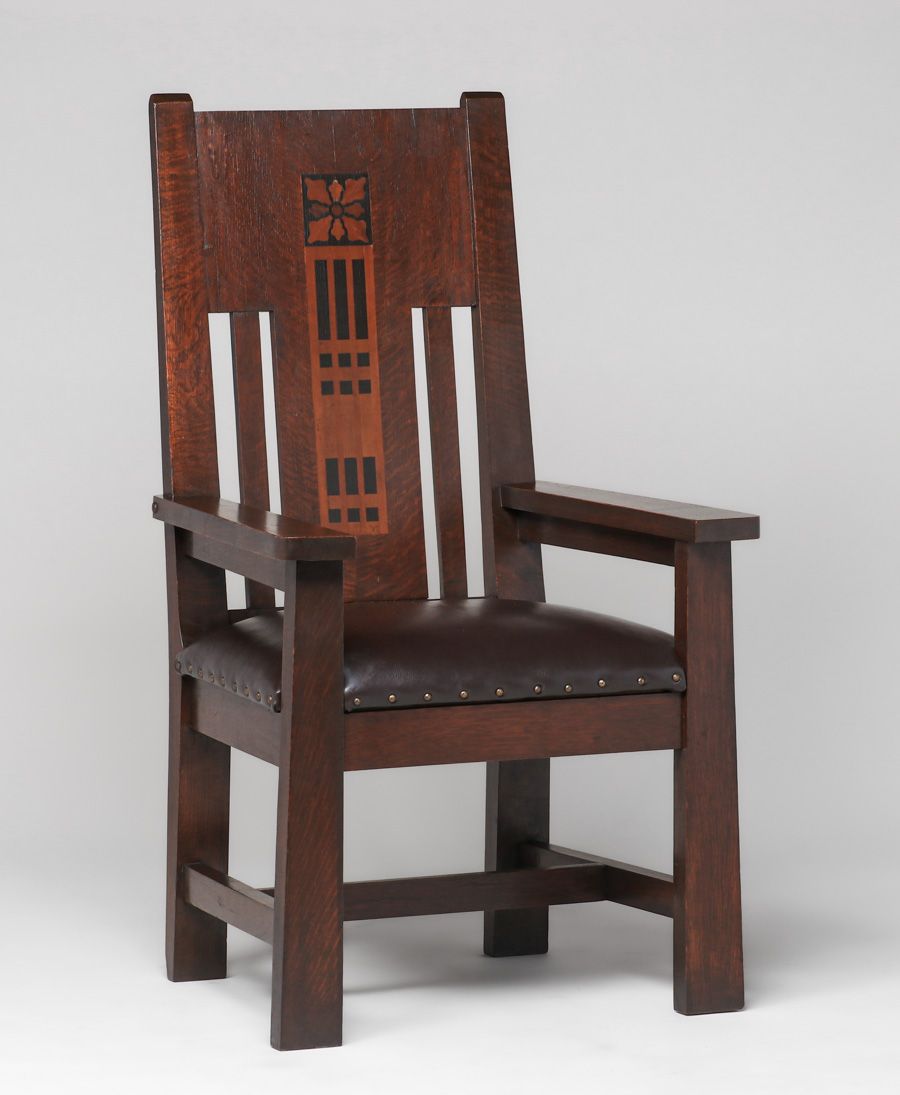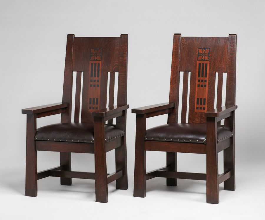 Shop of the Crafters Pair Inlaid Armchairs c1905-1910. Signed. Excellent original finish. Very sturdy. 48"h x 27"w x 23"d SOLD