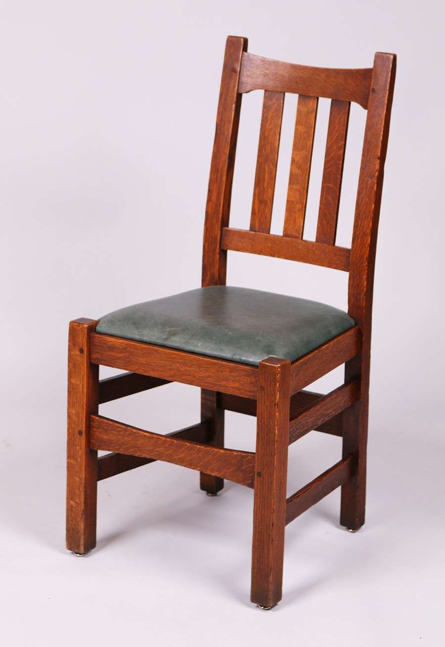 4 Stickley Brothers #379 1/2 Dining Chairs. Excellent original finish. Signed with branded mark. 37.5"h x 18.25"w x 16.5"d SOLD