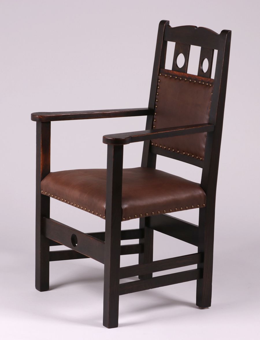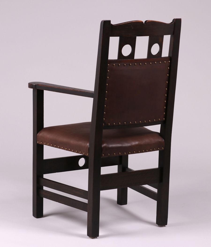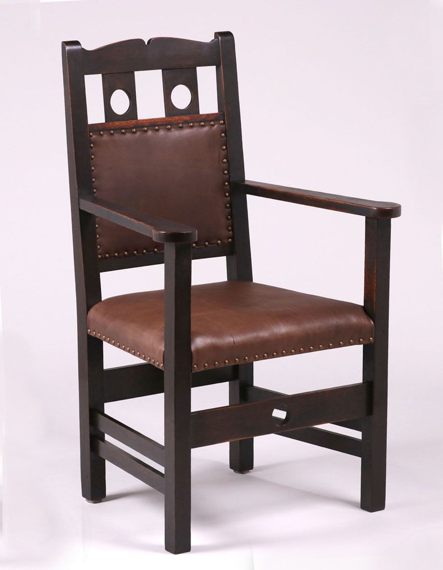 Early Stickley Brothers armchair with circle cutouts in back. Unsigned. Excellent original black finish. 25.5"w x 21.4" w x 42"h SOLD