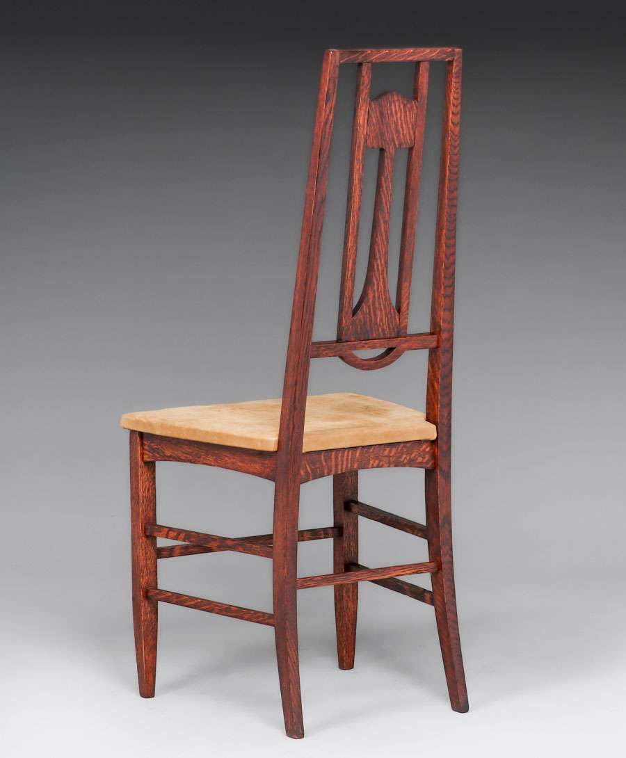 Early Stickley Brothers Inlaid Side Chair c1901. This is a very rare early example of the influence on early Stickley Brothers by C.F.A. Voysey. Unsigned. Nicely refinished. Very sturdy. 41.5"h x 17.5"w x 15.5"d SOLD