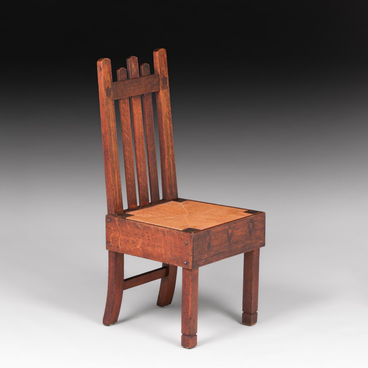Early Stickley Brothers "The Bewdley" Inlaid Hall Chair c1901. Remnant of two tacks that held original paper label. Nicely replaced hand woven rush seat. Excellent original finish. 42.5"h x 18.5"w x 18"d