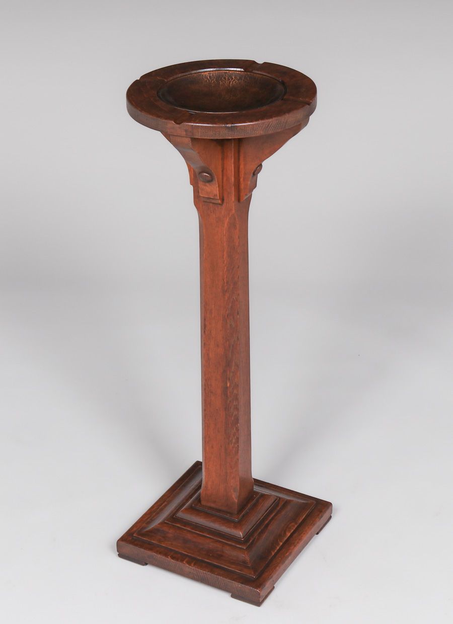 Stickley Brothers #142 Prairie School Oak Standing Cigar Ashtray c1910. New patina to hammered copper ashtray. Signed. Excellent original finish. 30"h x 10.25"d SOLD