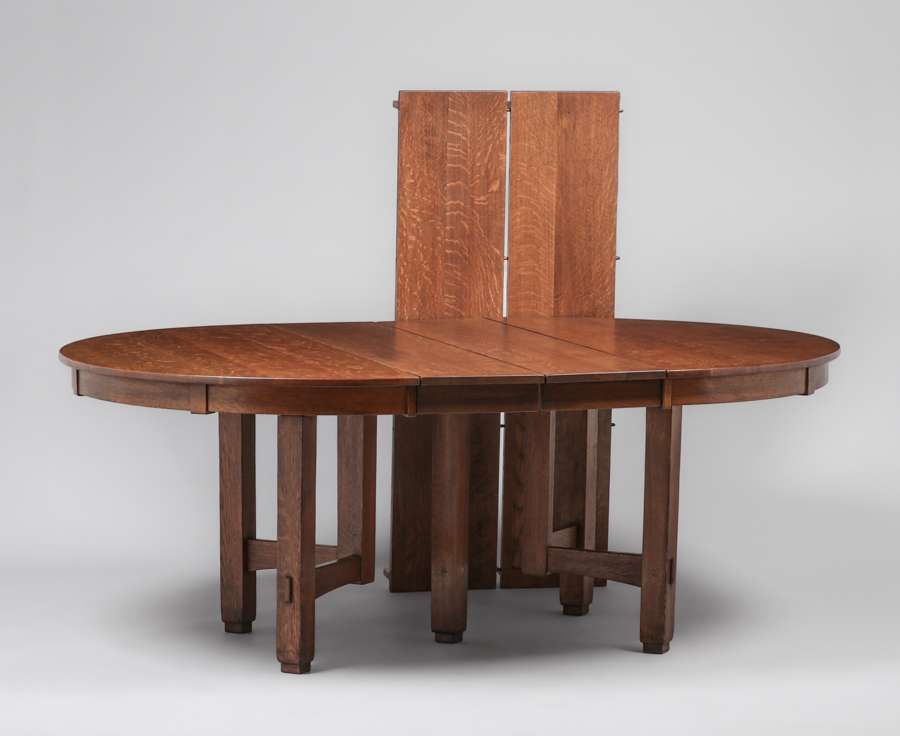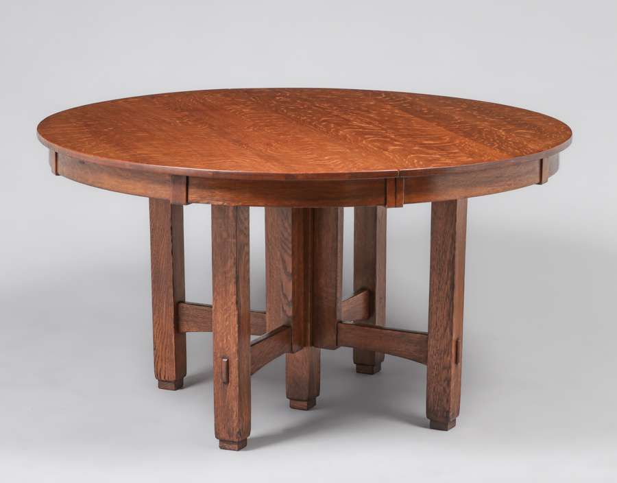 Stickley Brothers 54"d Dining Table c1910. Four new skirted 11"w leaves. Unsigned. Very nicely refinished. 54"d x 30"h (54" x 98" with leaves) SOLD