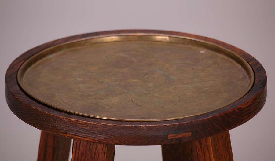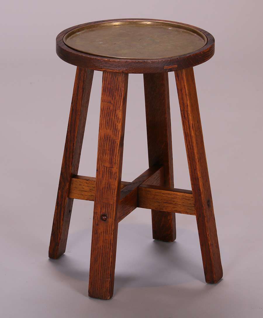 Stickley Brothers brass-top taboret with splined top. Unsigned. Excellent original patina. 16.5"h x 10.5"d SOLD