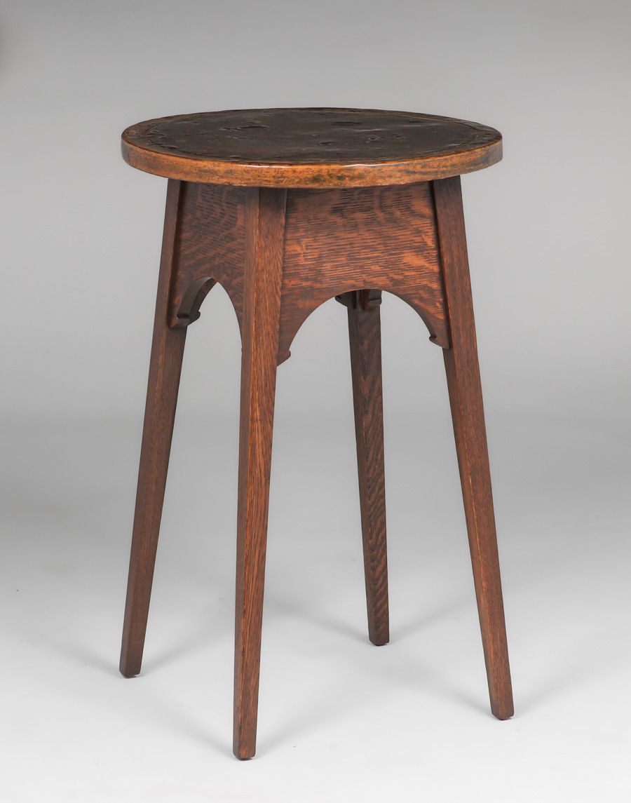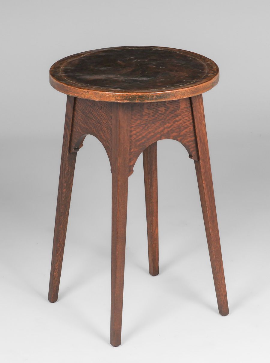 Stickley Brothers Copper-Top Table c1910. Unsigned. Very nicely refinished. Wear and dents to original copper top. 18"d x 28"h SOLD
