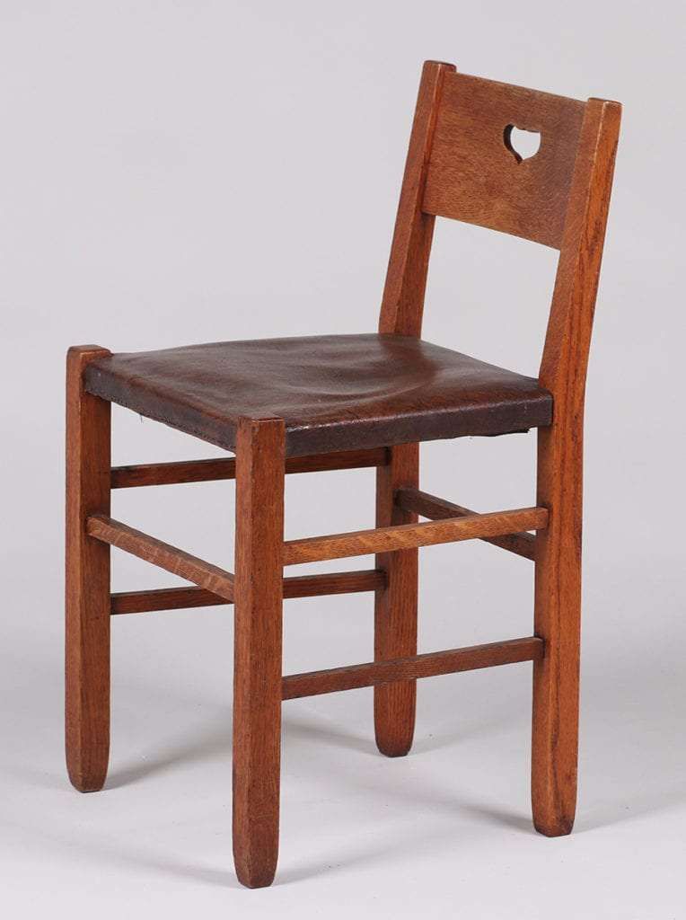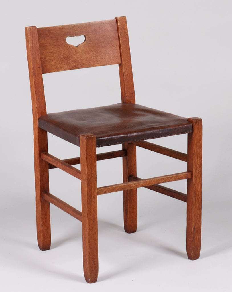 Stickley Brothers vanity chair with heart cutout handle. Unsigned. Excellent original finish and original leather. Very sturdy. 29"h x 16.5"w x 15"d SOLD