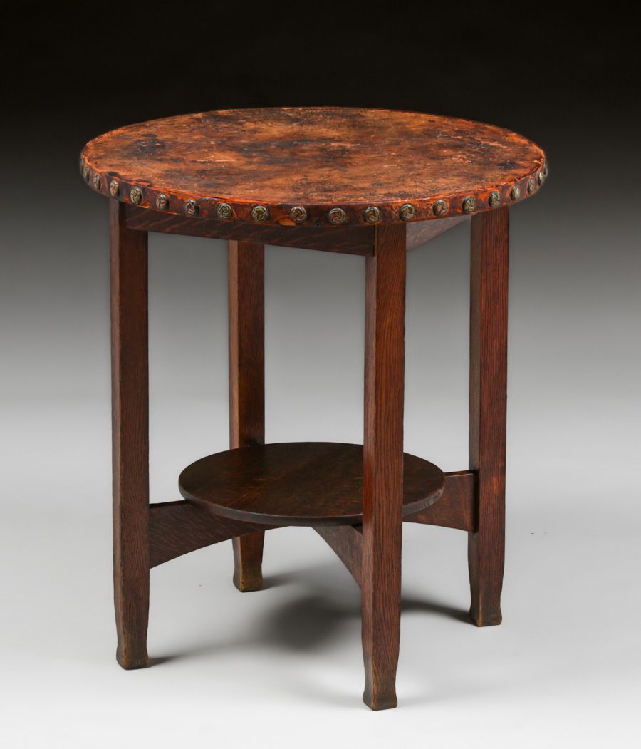 Stickley Brothers Leather-Top Table c1905. Unsigned. Excellent original finish. Separations to beautiful original leather top. 26.5"d x 29.75"h