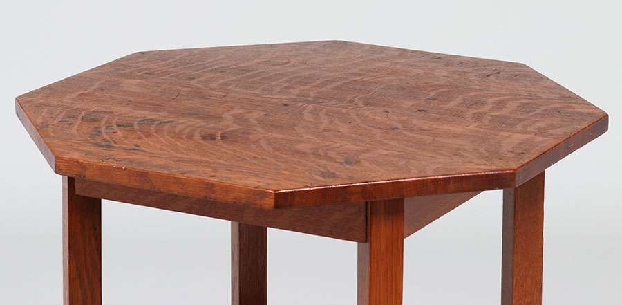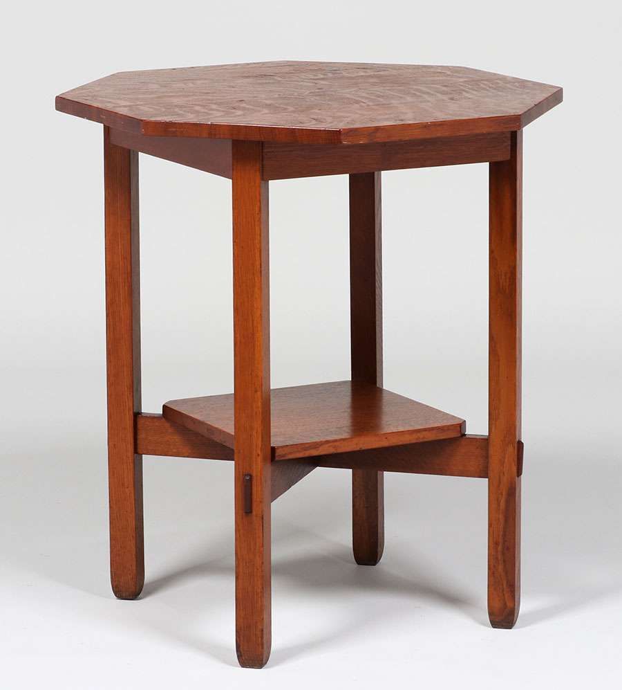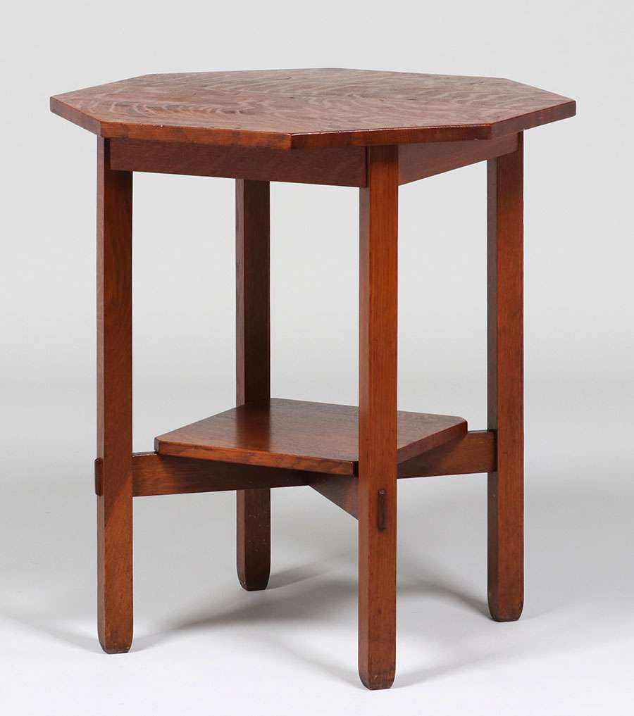 Stickley Brothers Octagonal Lamp Table c1905. Signed with oval paper label. Some minor stains to top. Original finish. 29.75"h x 26"d SOLD
