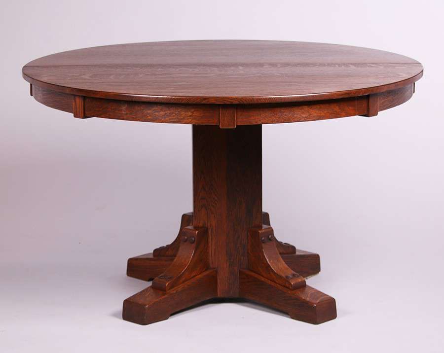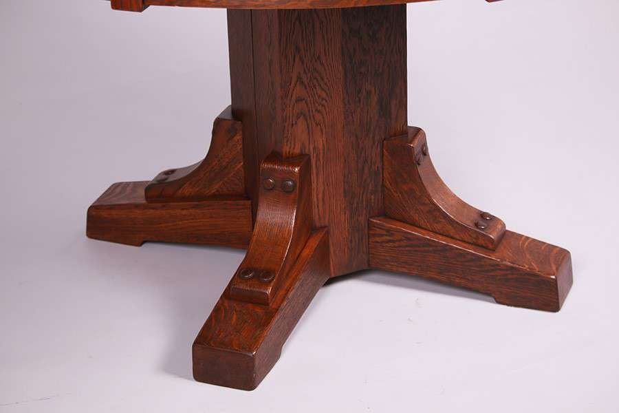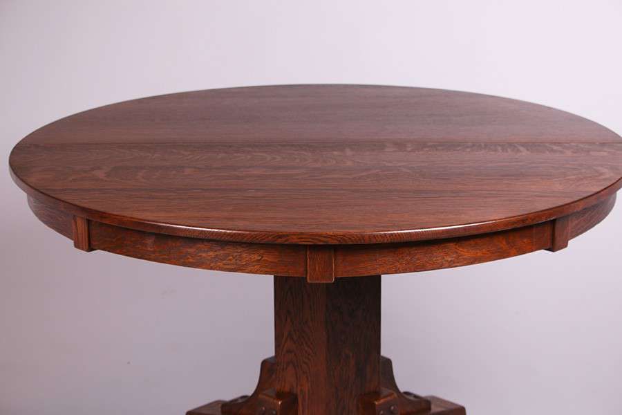Stickley Brothers Pedestal Dining Table. Signed. Refinished with four new skirted 11" leaves. 48"d x 29"h. Measures 92" x 48" with the leaves. SOLD
