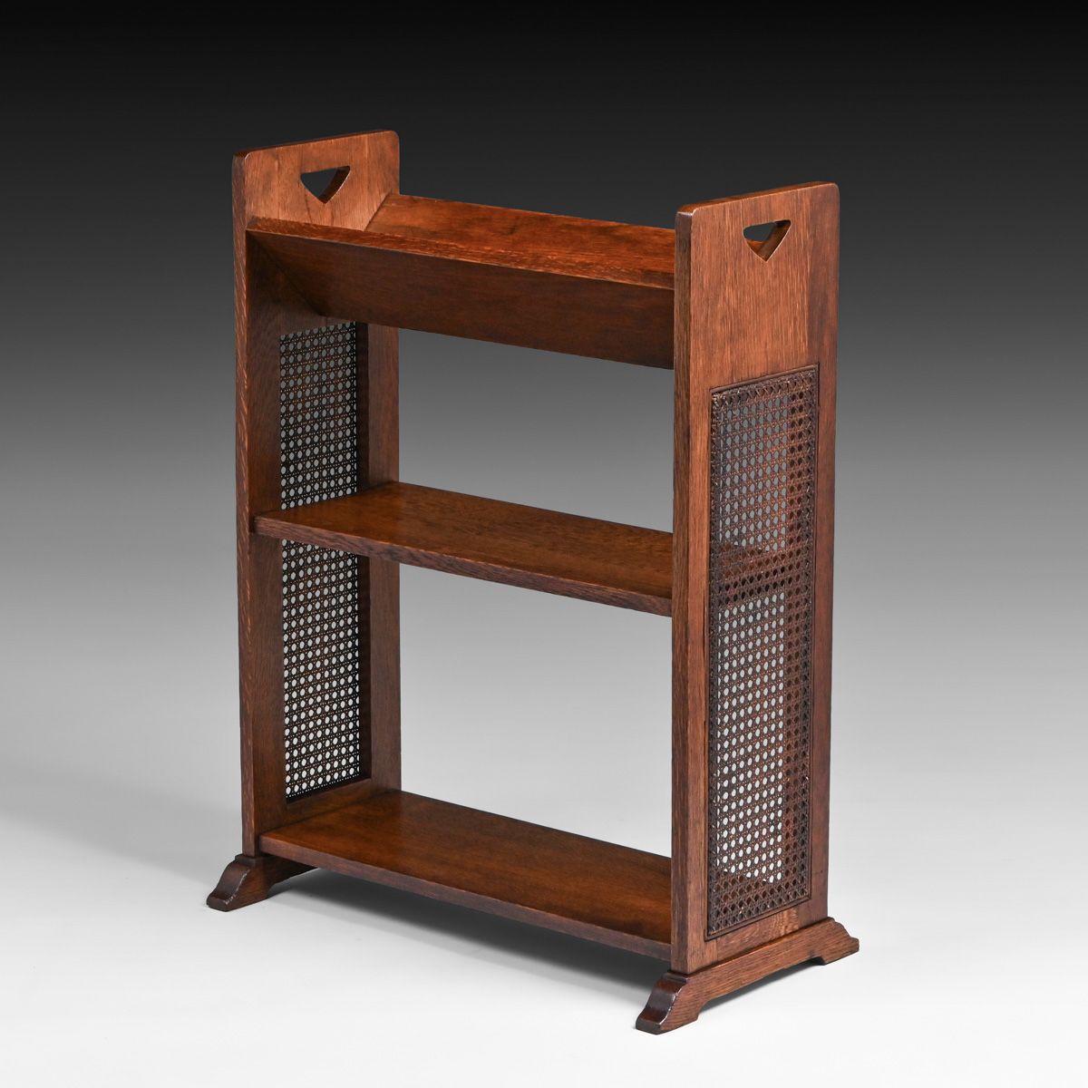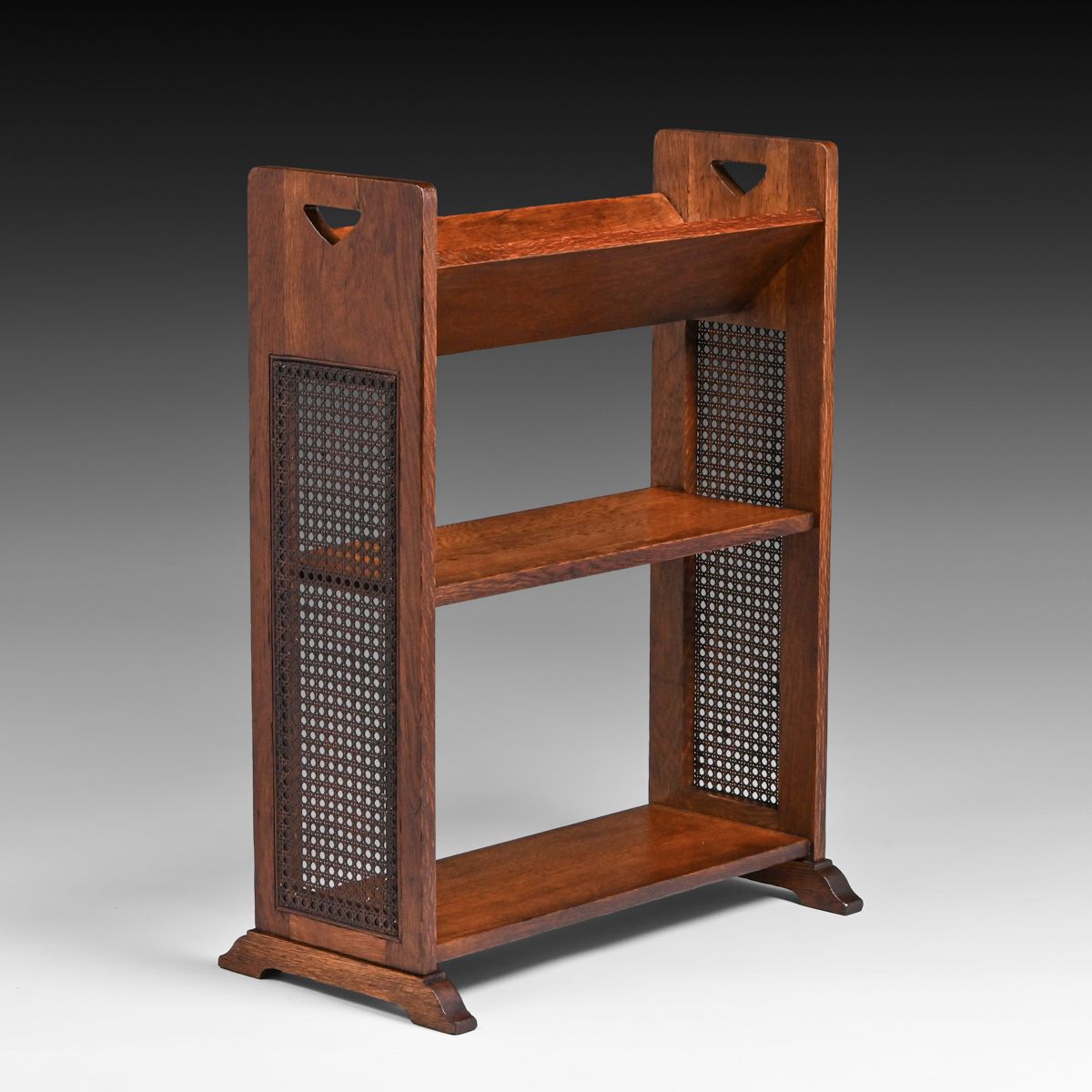 Stickley Brothers Prairie School Oak & Cane Book Trough c1910. Signed only with a retailer's label. Excellent original finish and original cane. 32"h x 24.5"w x 13.25"d