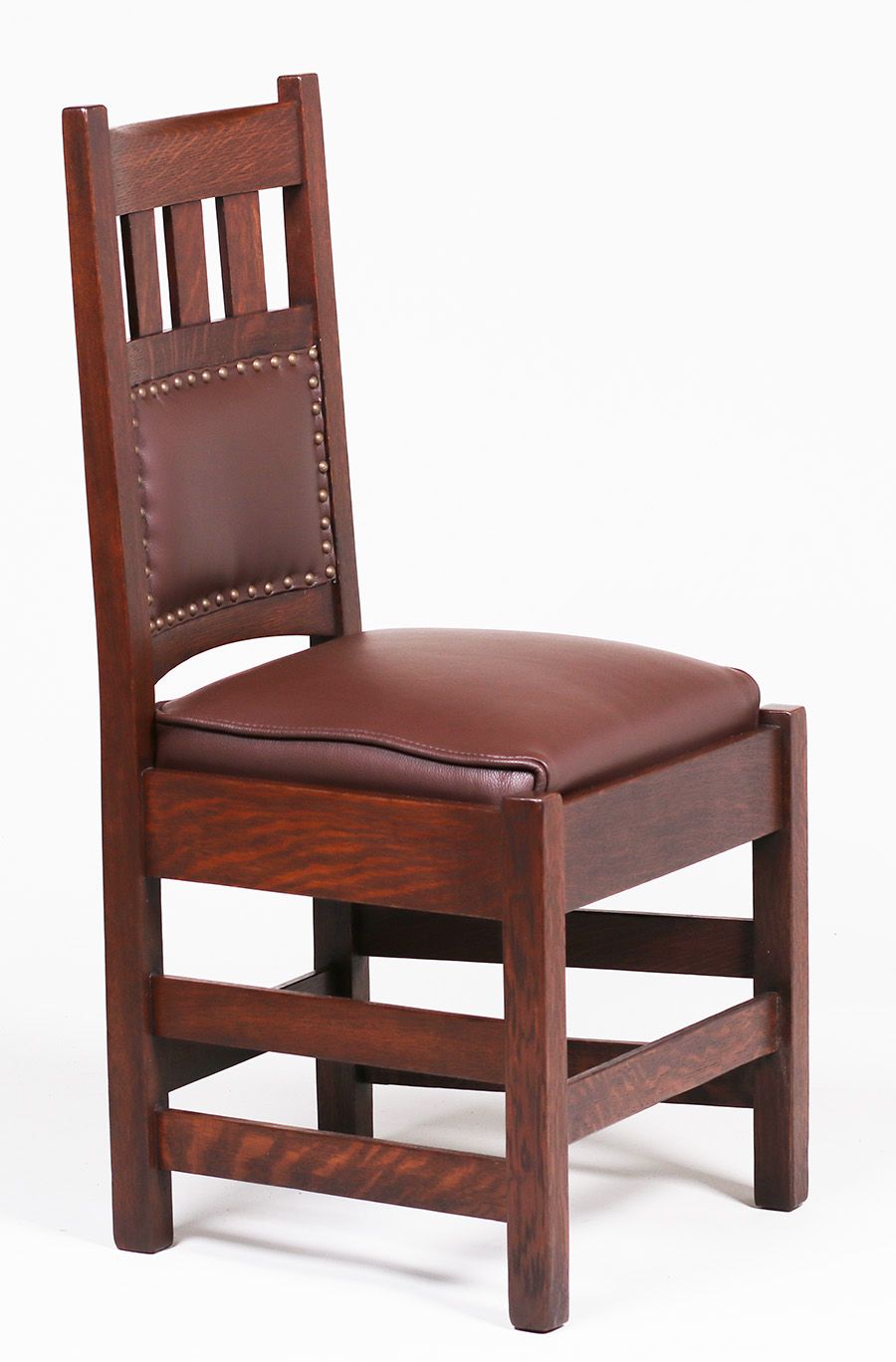 Stickley Brothers side chair with three short slats above upholstered lower back. Unsigned. Nicely refinished. 38.5"h x 19.5"w x 17.5"d SOLD