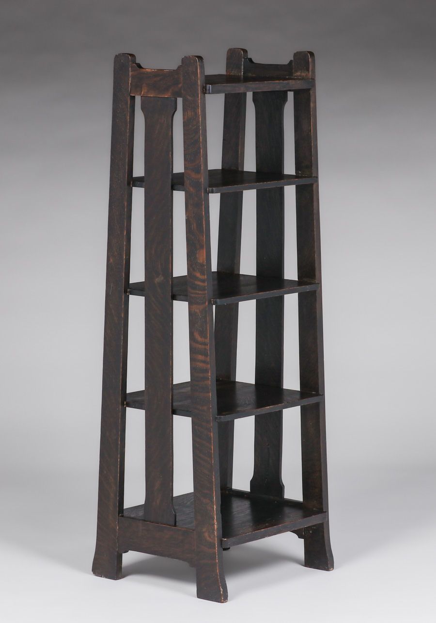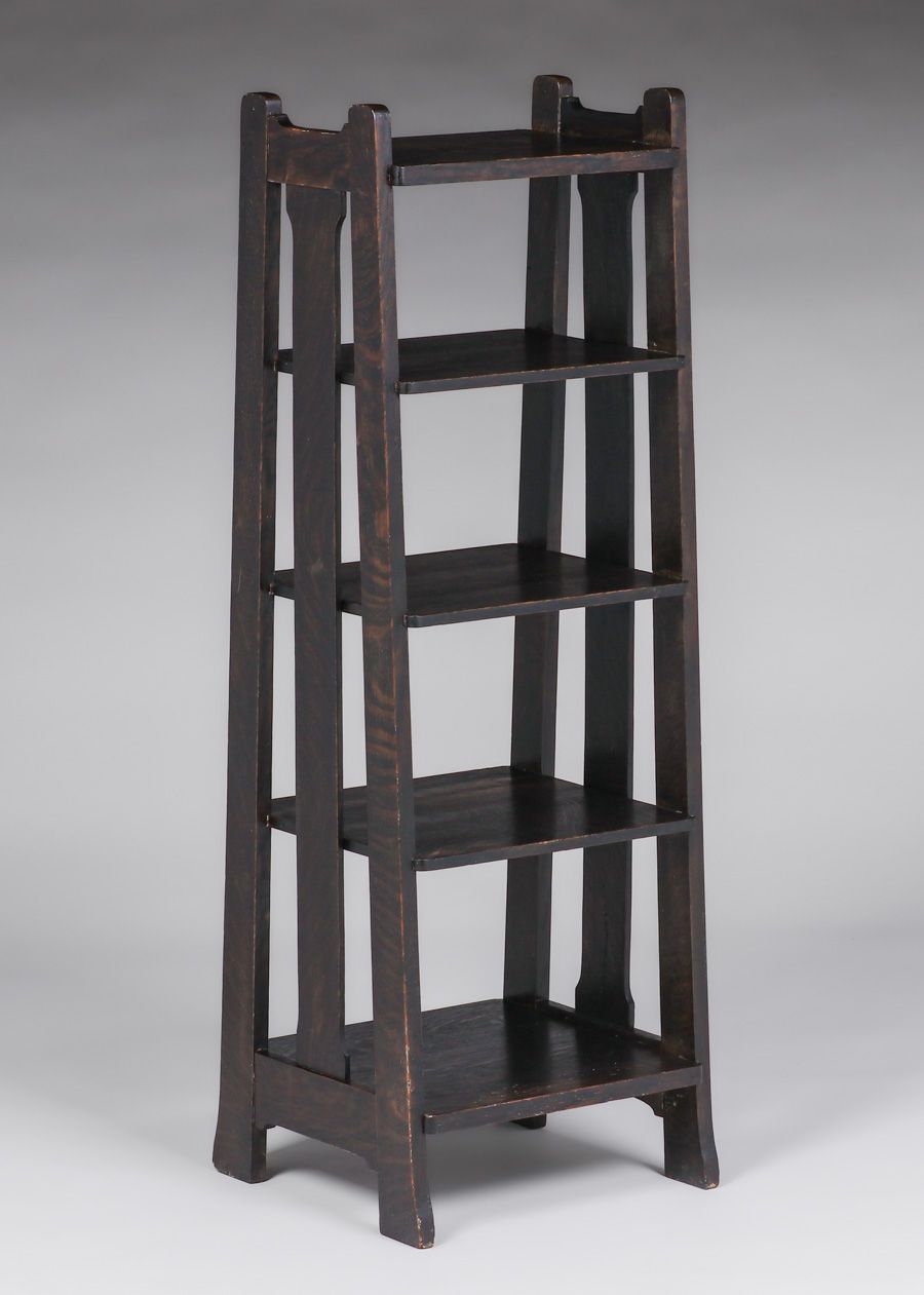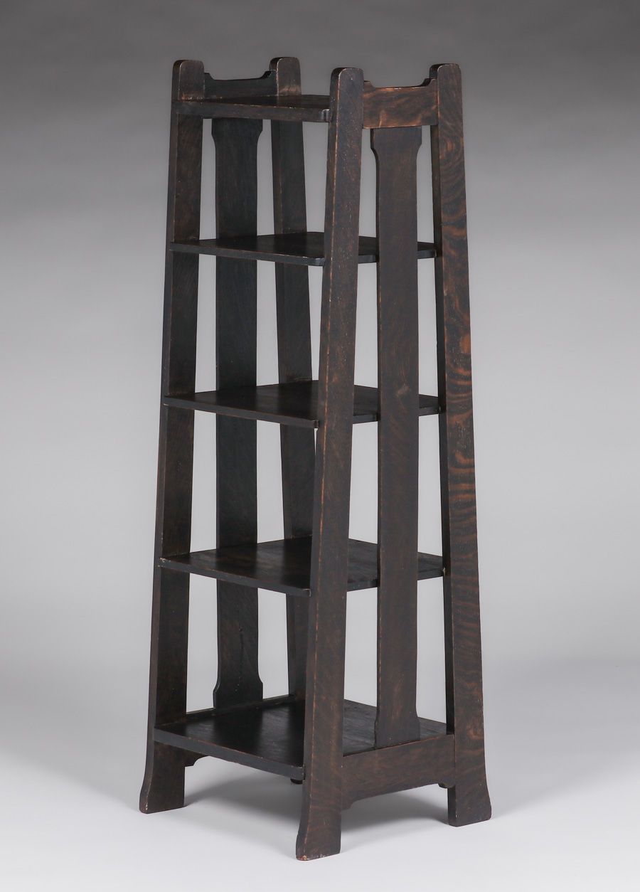 Stickley Brothers Slatted Magazine Stand c1910. Unsigned. Excellent black original finish. 42"h x 14"w x 14"d at base x 10"d at top SOLD