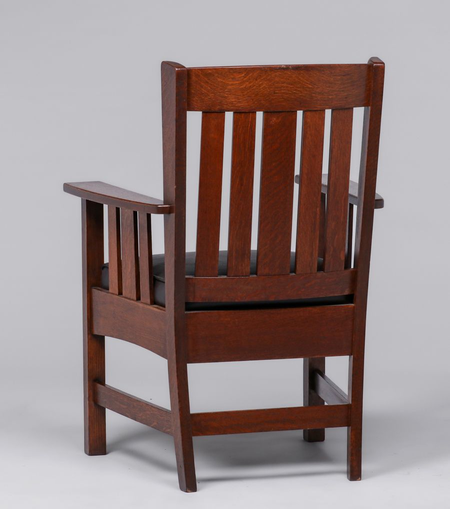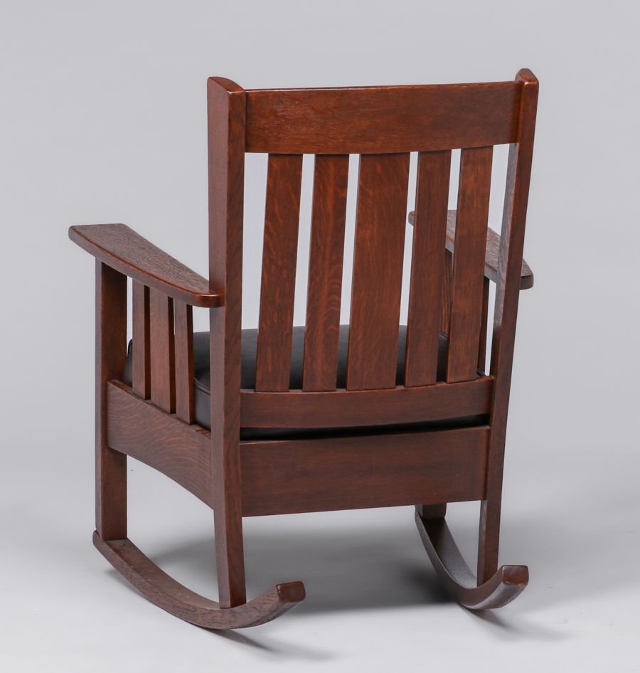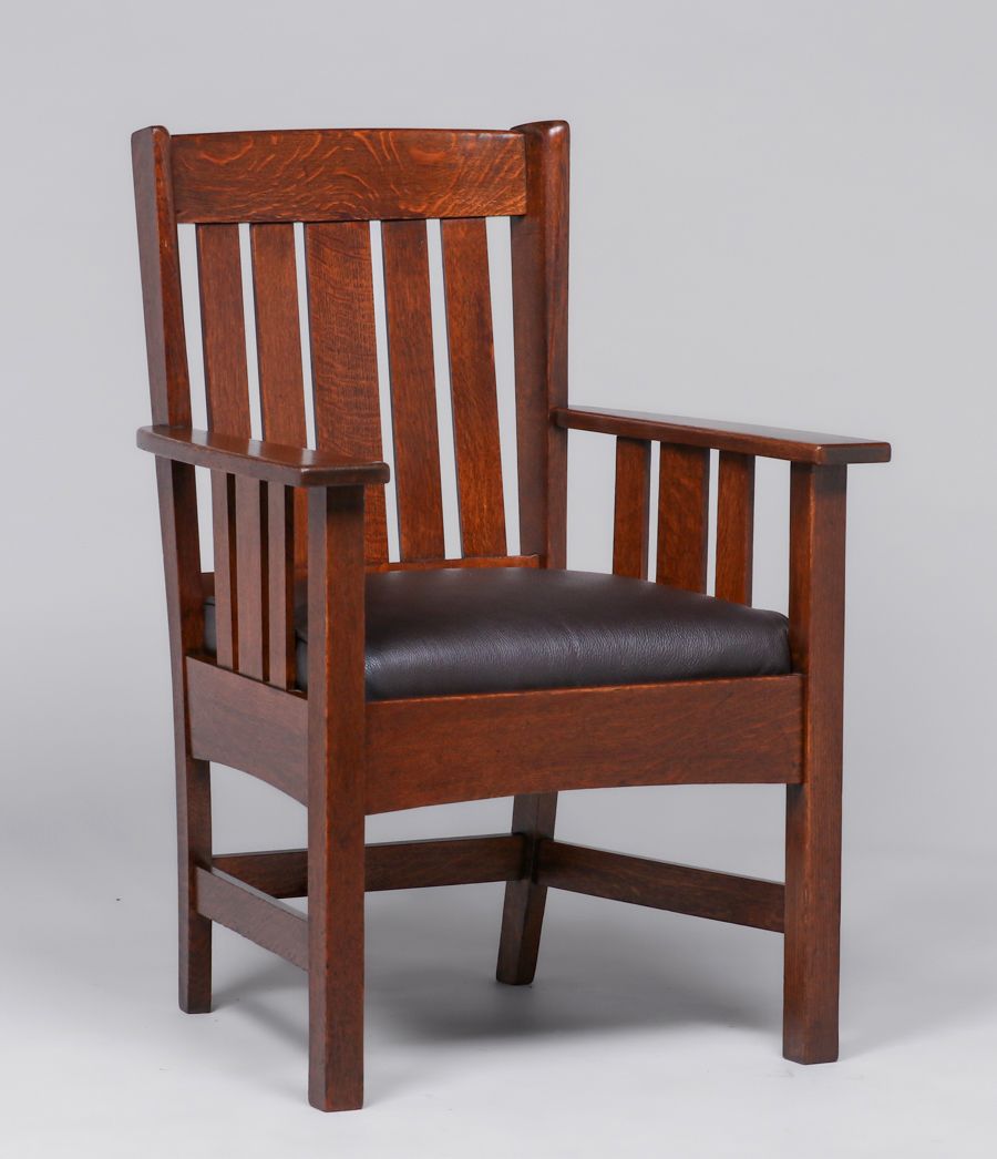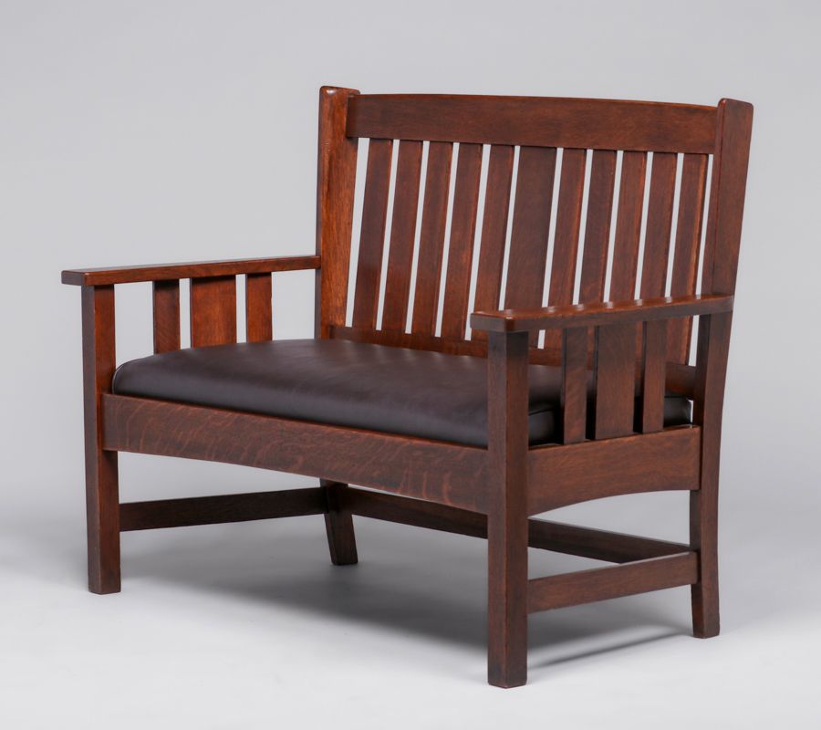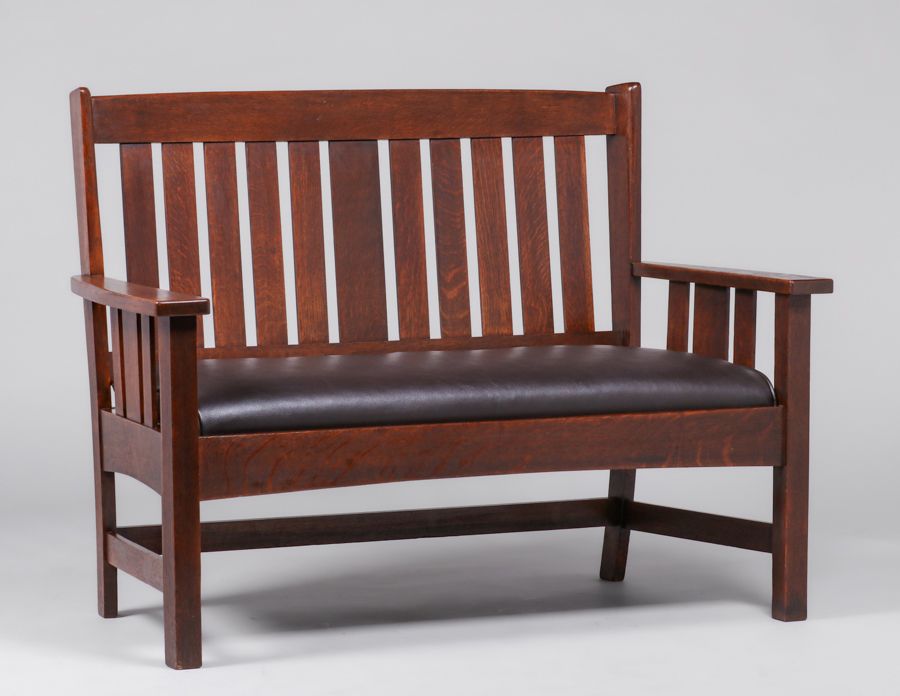 Stickley Brothers Three-Piece Slatted Armchair, Rocker & Settle Set c1910. Signed. Excellent original finish. Settle 54w x 39h x 25d. Armchair 37.5h x 26.5w x 24d. Rocker 34h x 26.5w x 29.5d SOLD