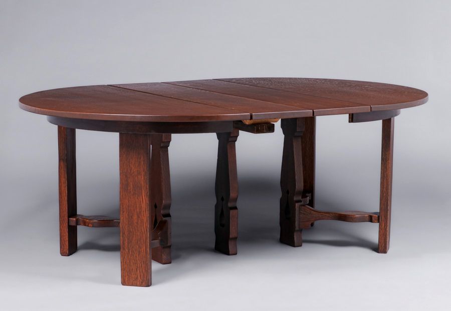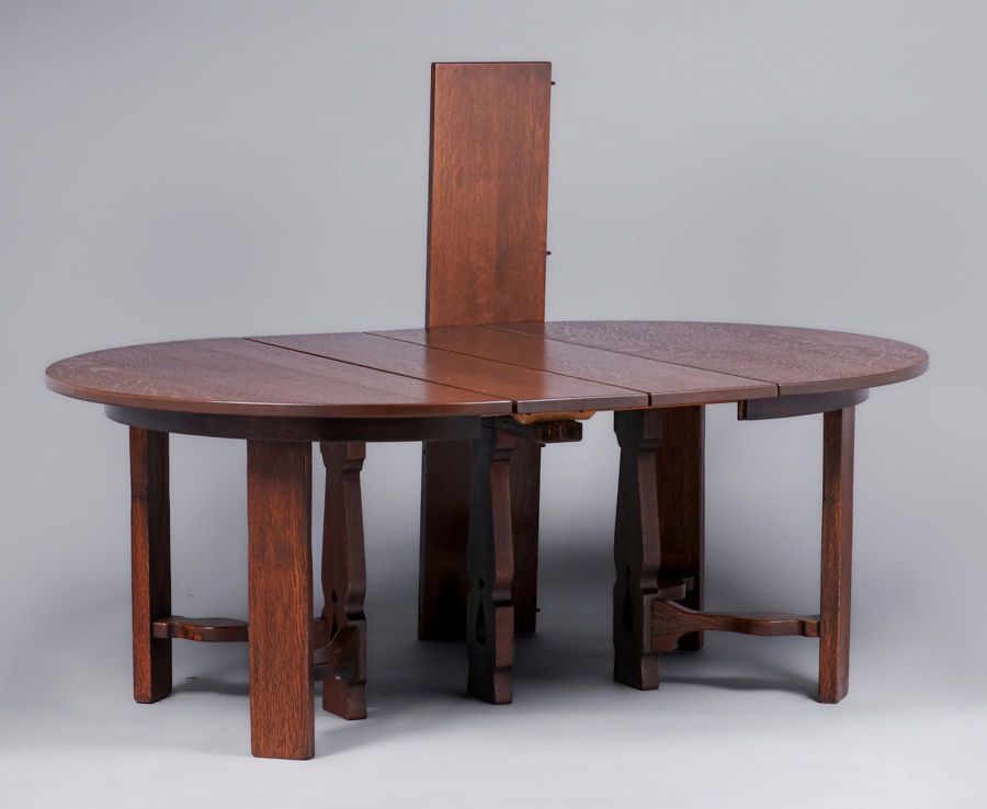 Tobey Furniture Co 54"w Five-Leg Cutout Dining Table c1902. Unsigned. Very nicely refinished. Three new 11.75" custom quarter-sawn oak leaves. 54"d x 29.5"h (extends to 89" x 54") SOLD