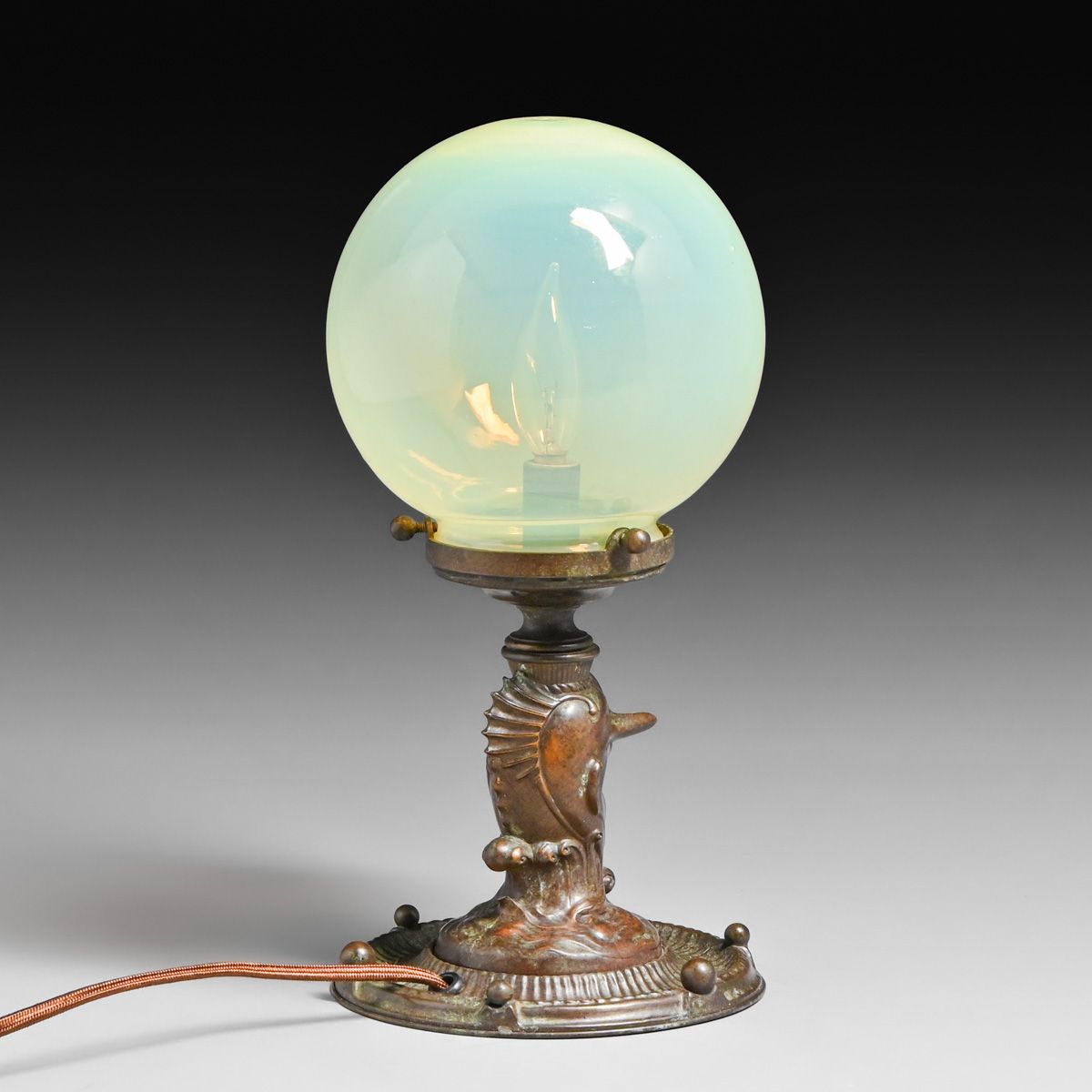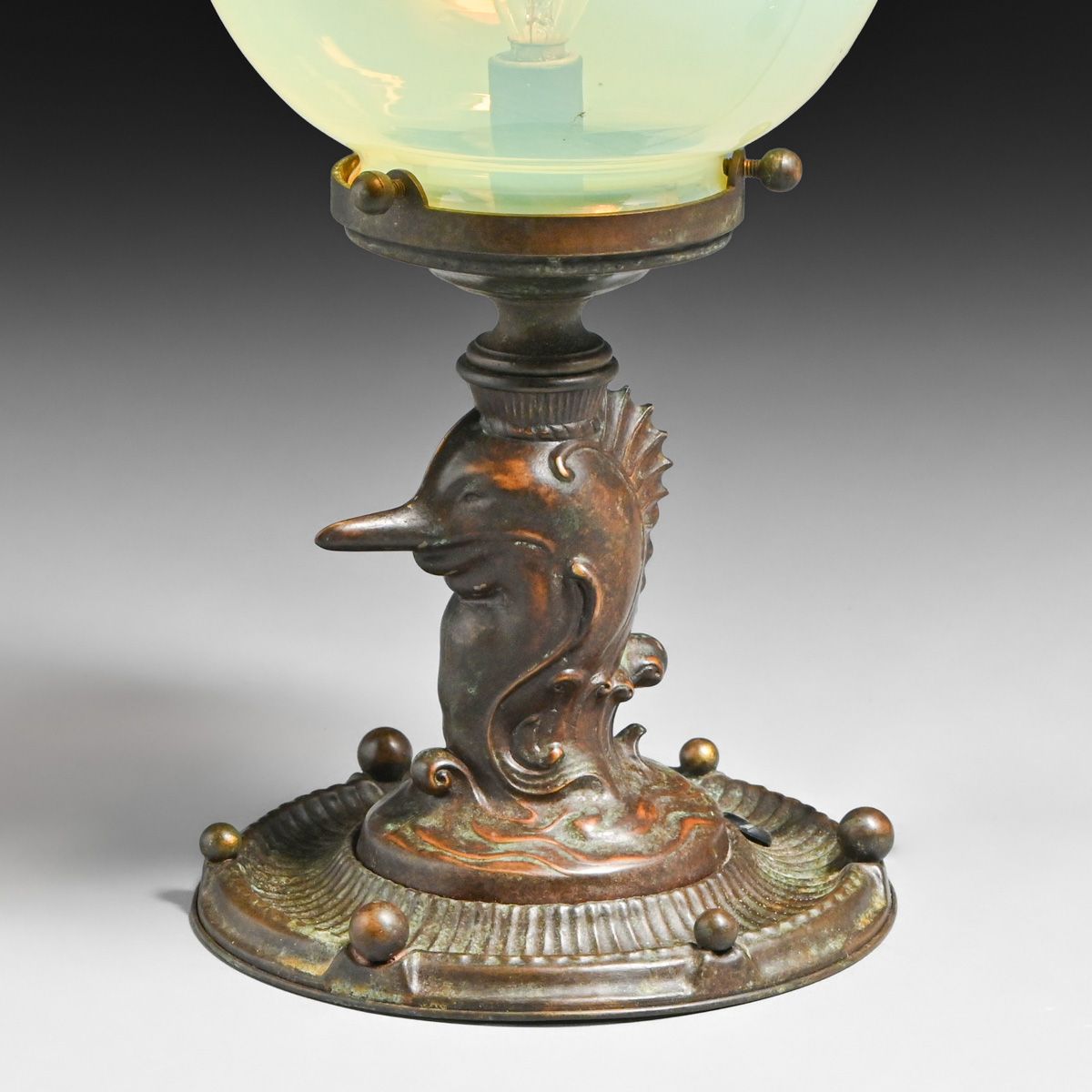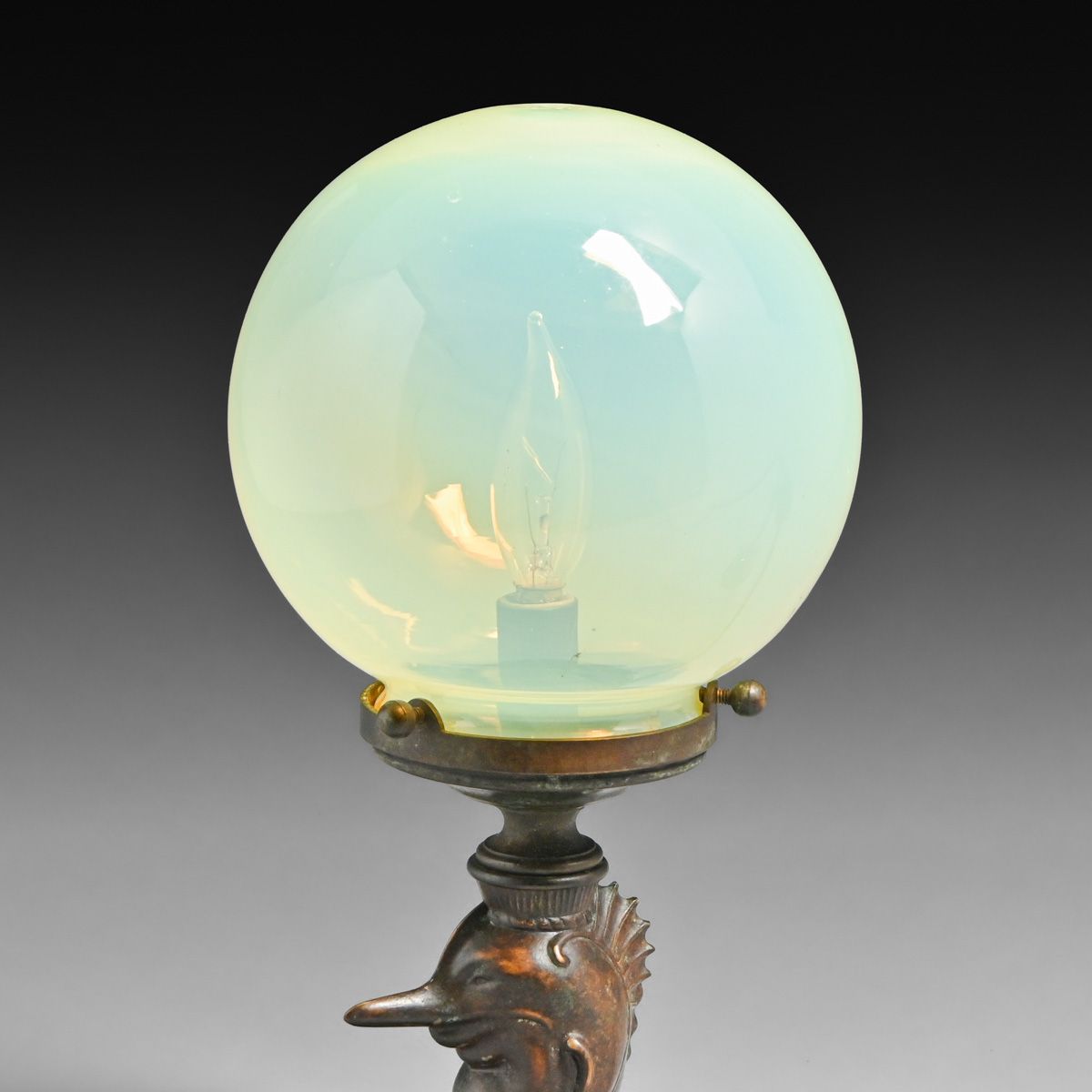 - Arts & Crafts Bronze Swordfish & Opaline Glass Globe Lamp c1920s