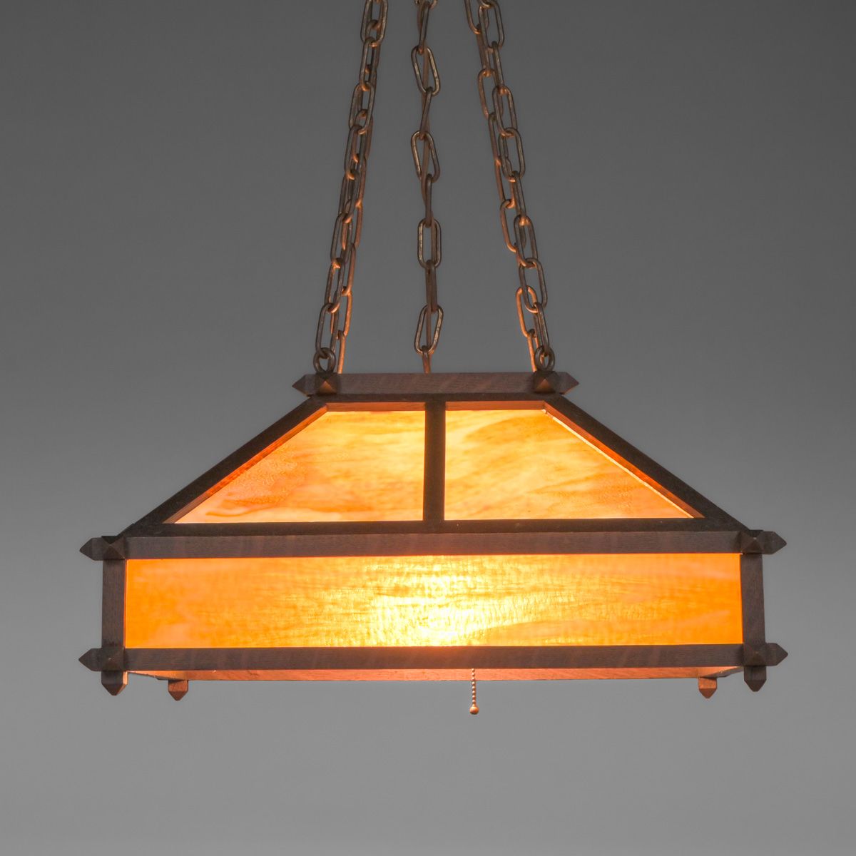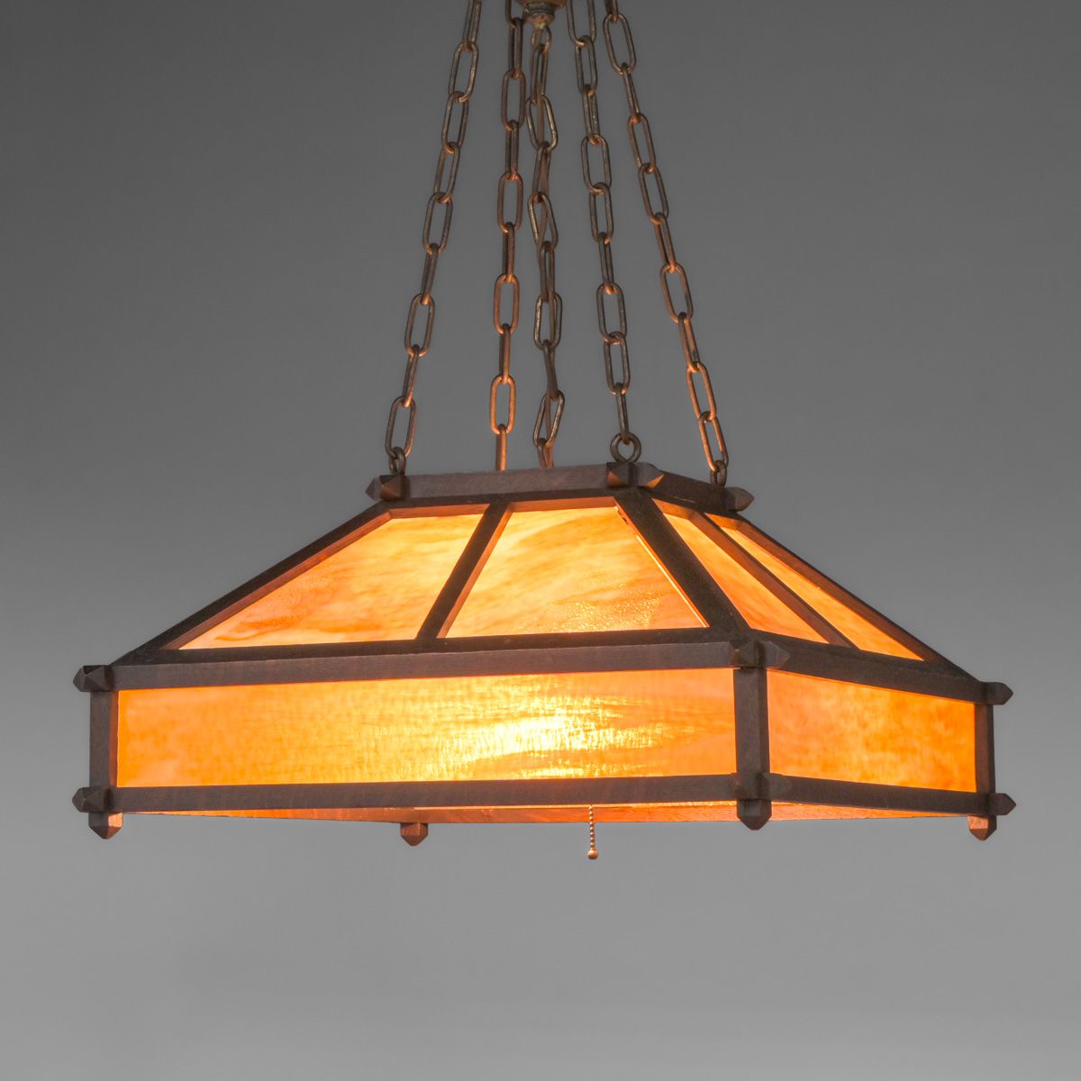 - Arts & Crafts Period Oak & Amber Slag Glass Chandelier c1910