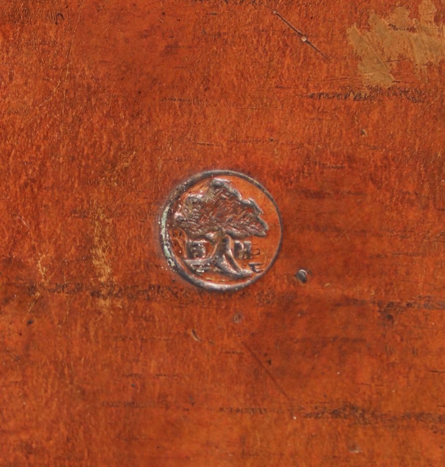 Extremely Rare B&M Shop Hammered Copper & Mica Rivetbase Lamp c1909-1910. Signed. Excellent original patina and original mica. Little is known about the B&M Shop except that they were somehow connected with early Dirk van Erp. See Bay Area Copper 1900-1950, Dirk van Erp & His Influence page 107-108 for more info. 16″h x 14″d SOLD