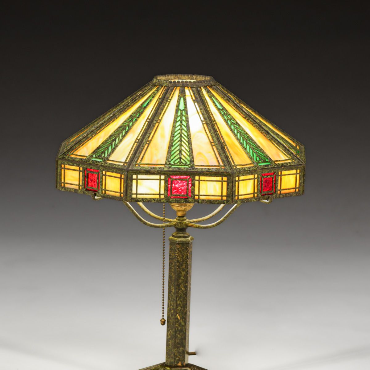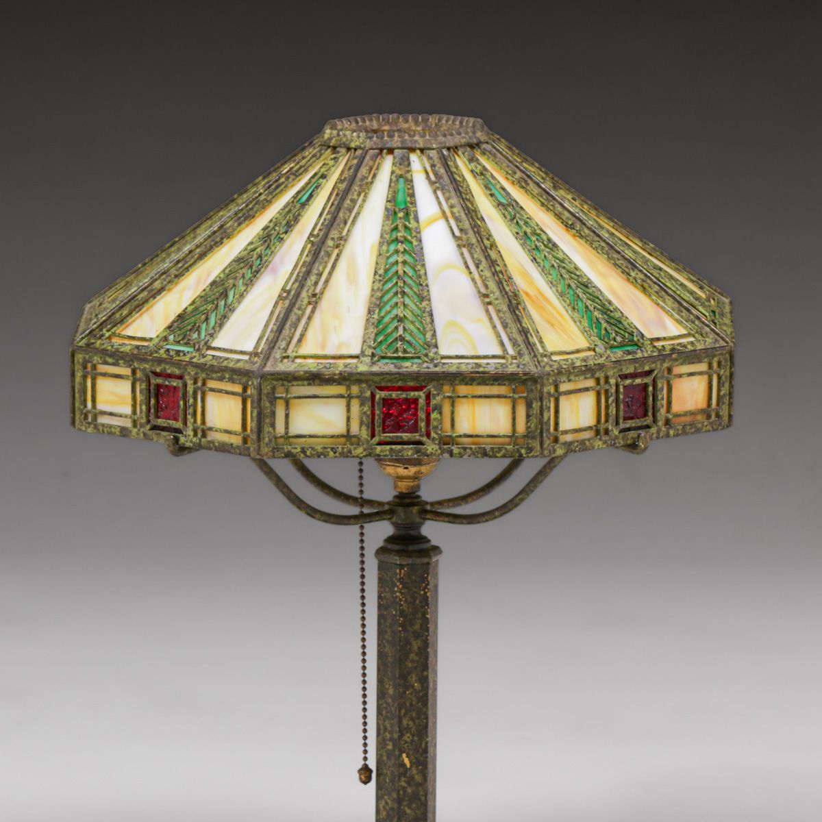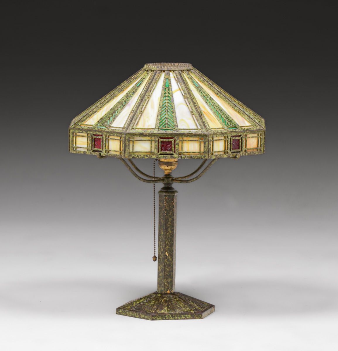 - Bradley & Hubbard #216 Prairie School Overlay Slag Glass Lamp c1910