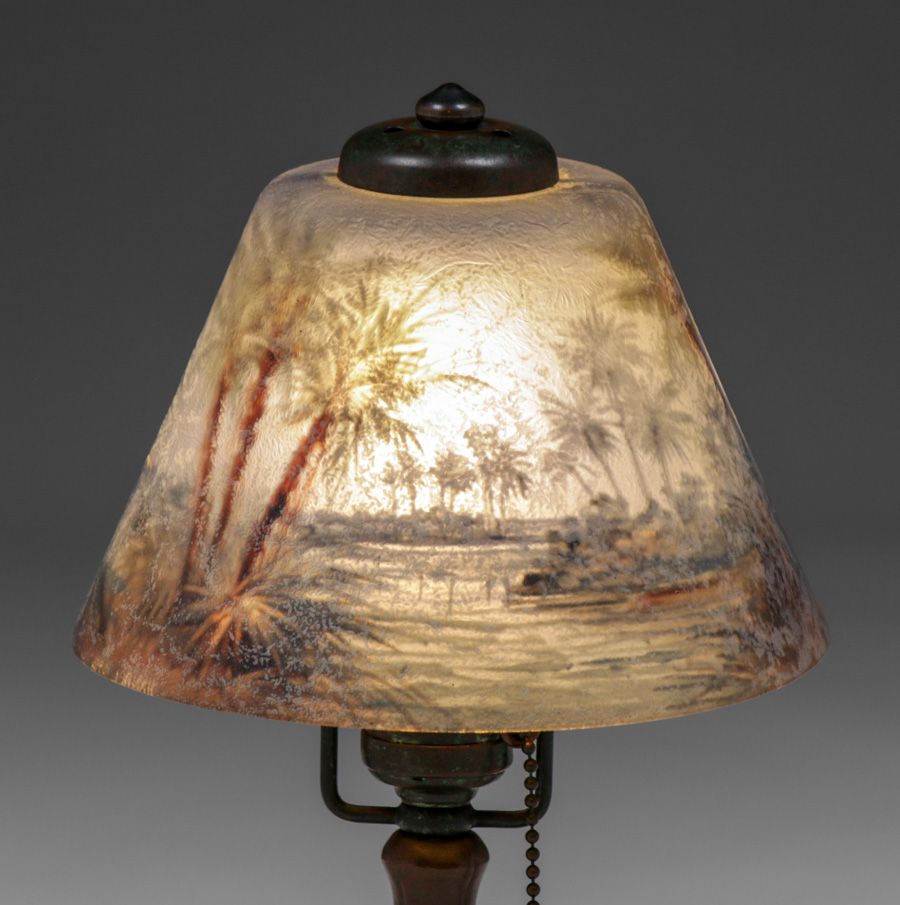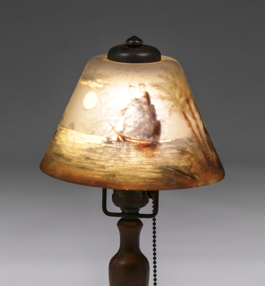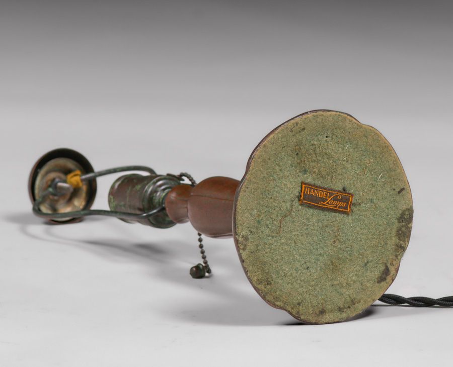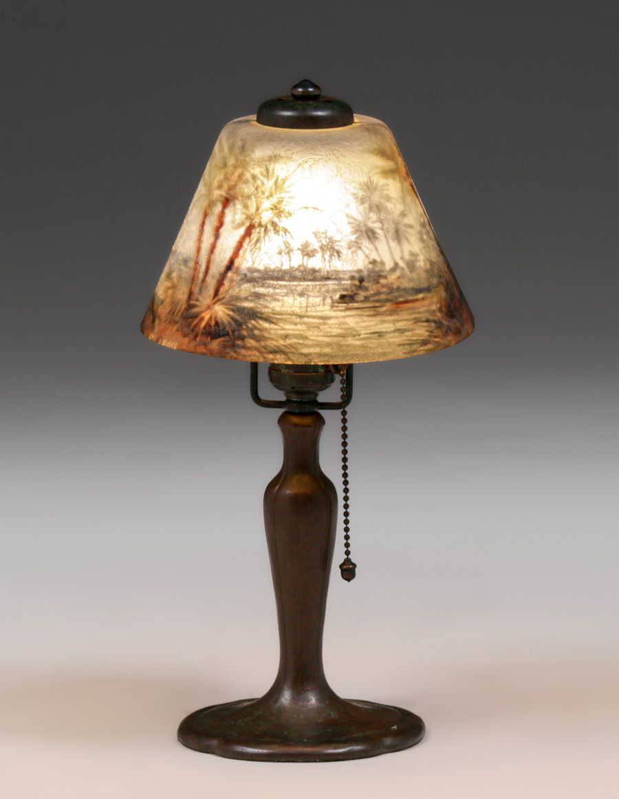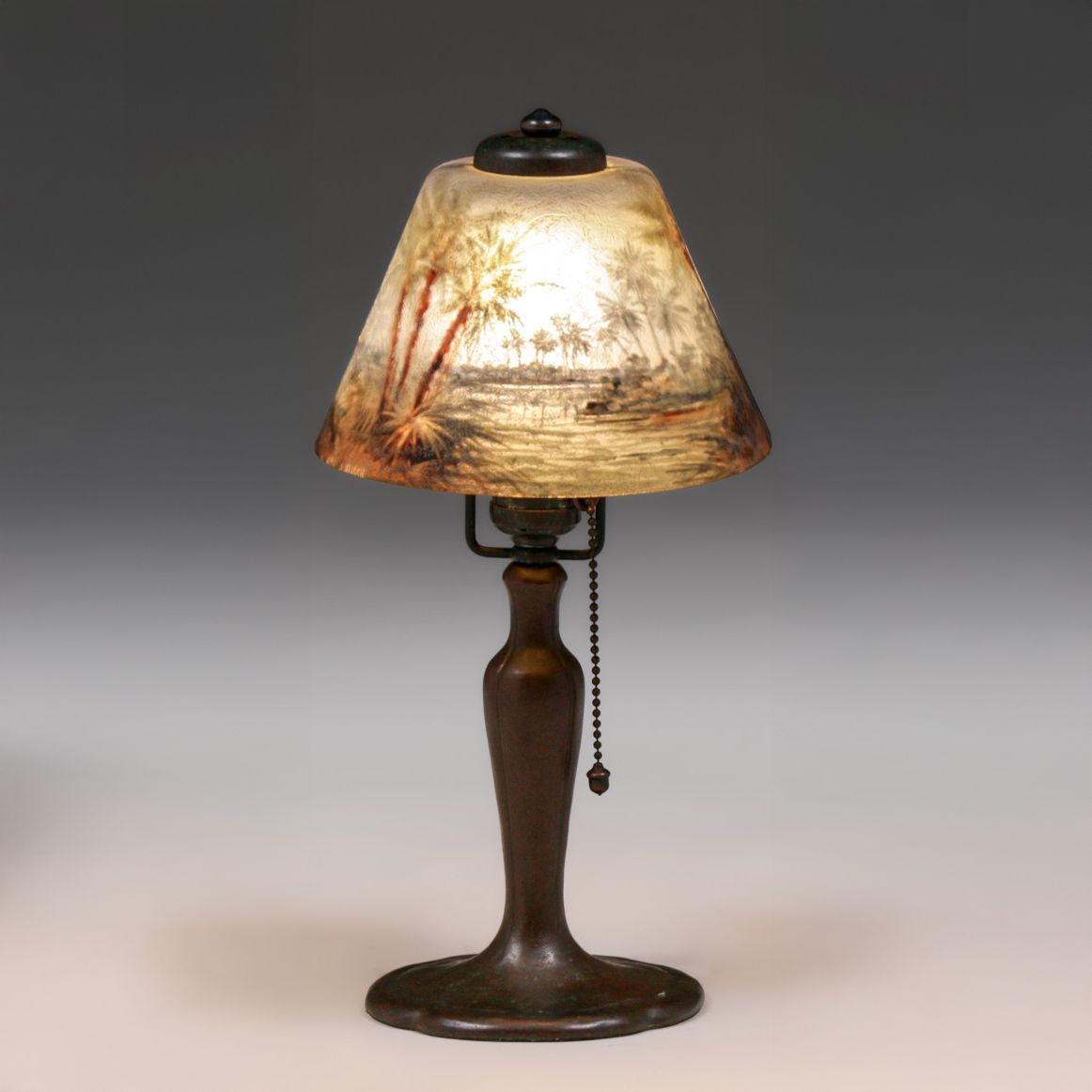 Handel #6558 Reverse-Painted Boudoir Lamp c1910. Signed. Excellent original patina. Original reverse-painted glass in perfect condition. 13.75"h x 6.75"d