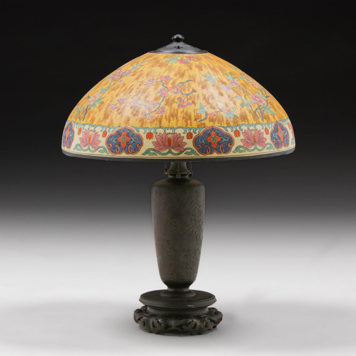 Handel #6631 Cherry Blossom & Lotus Reverse-Painted Lamp c1920s. Signed. Excellent original patina. Original reverse-painted Handel shade in exquisite condition. 23"h x 18"d