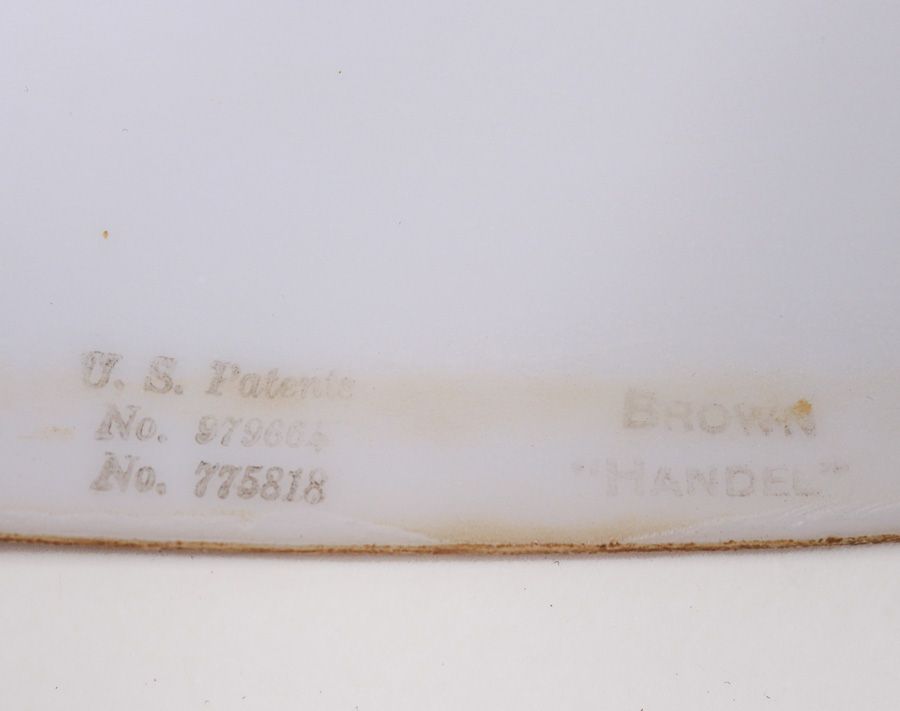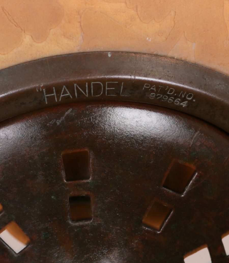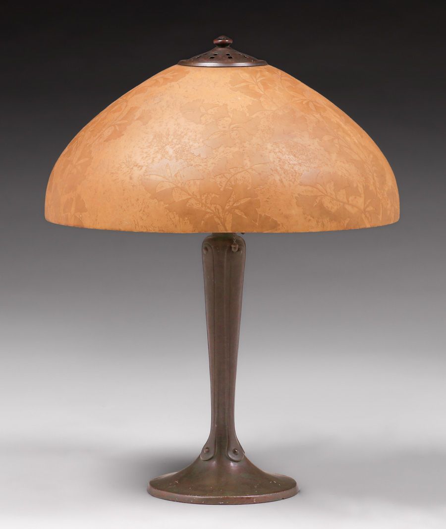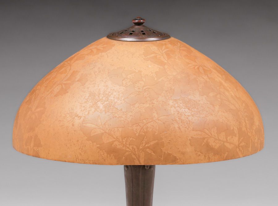 Handel Acid-Etched Ginkgo Leaf Lamp c1910. Signed. Excellent original patina. Original glass in excellent condition. 23.5″h x 18″d