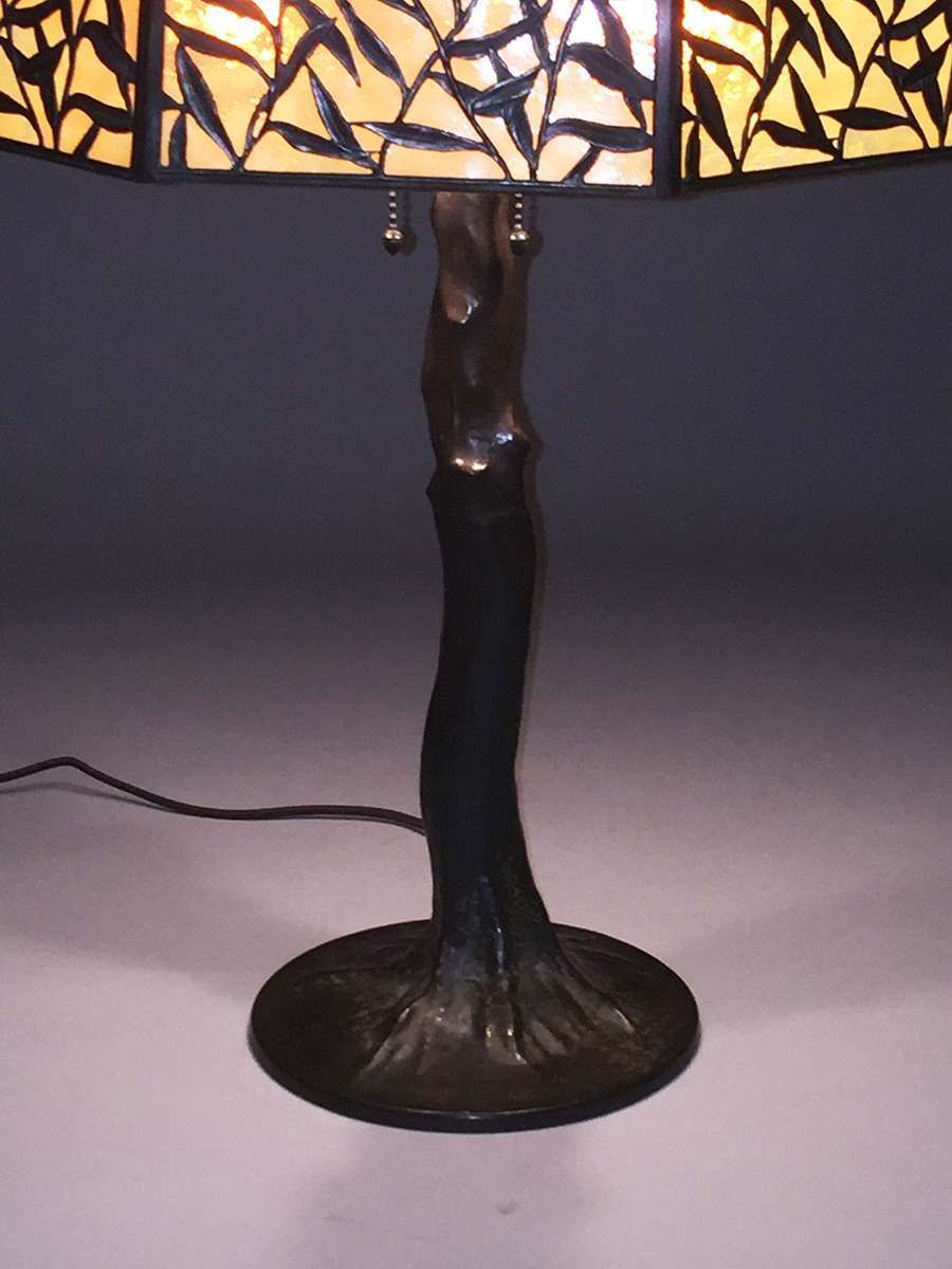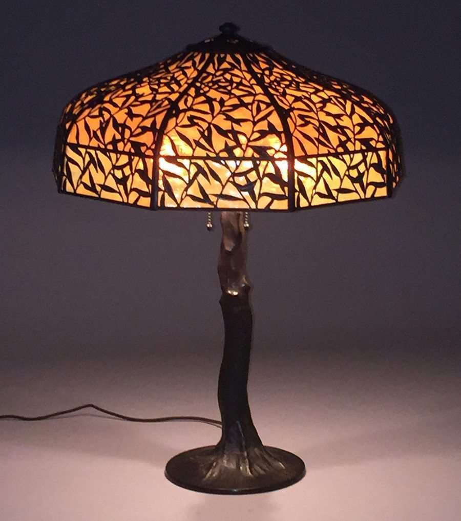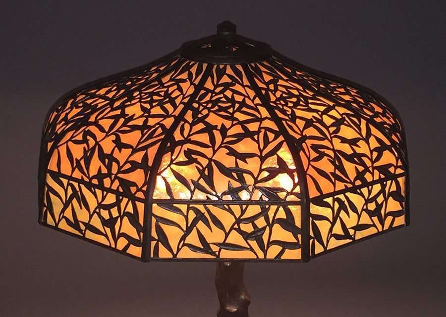 Handel bamboo leaf overlay lamp. Signed on top of shade. Excellent original patina. 26"h x 19.5"d SOLD