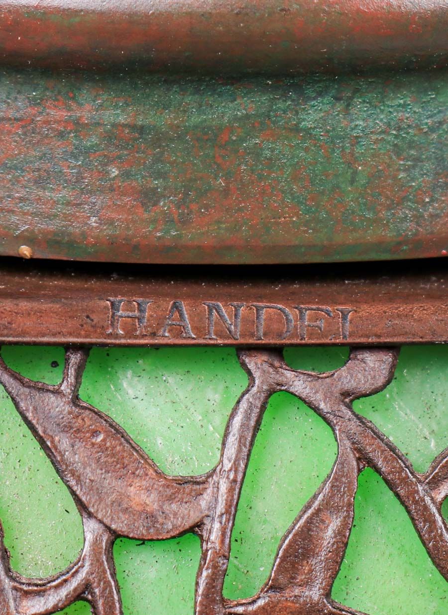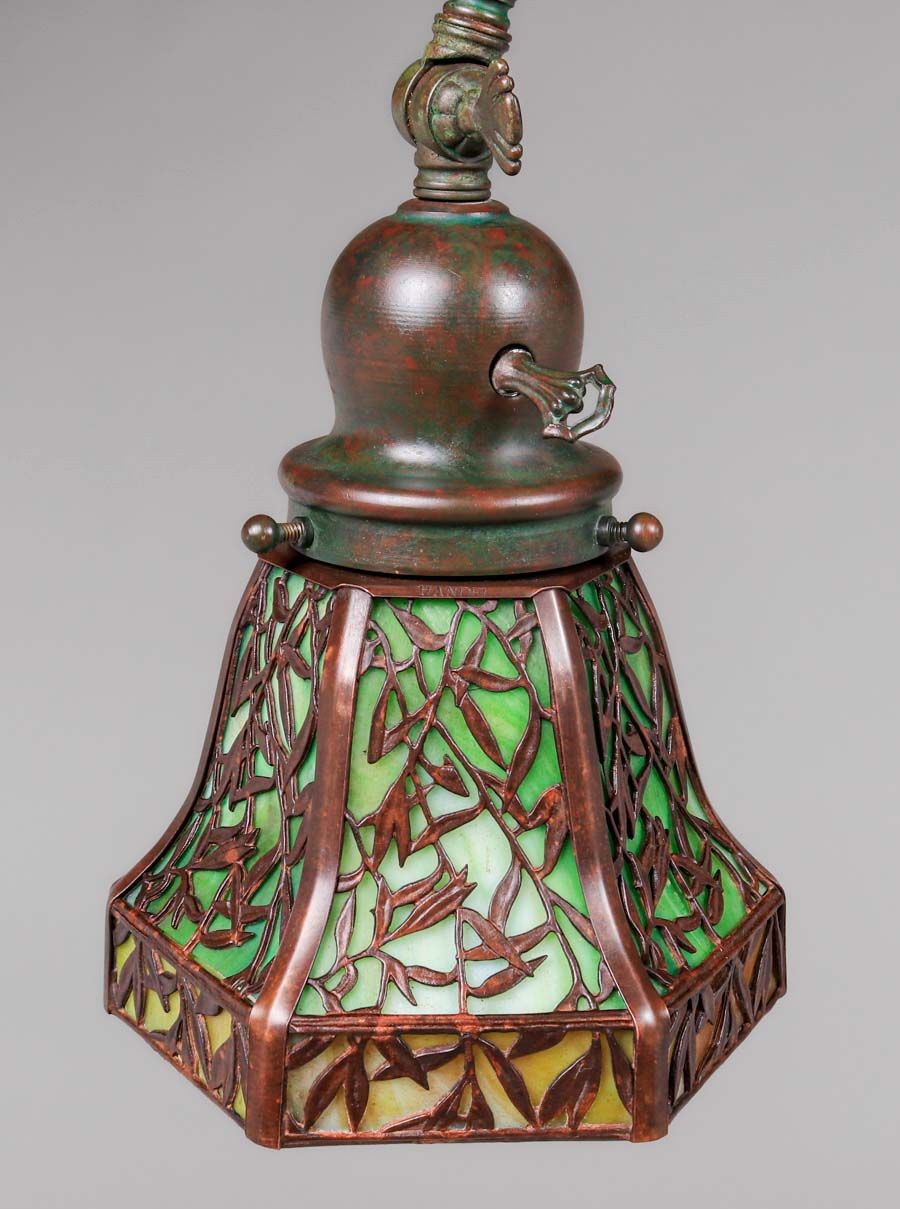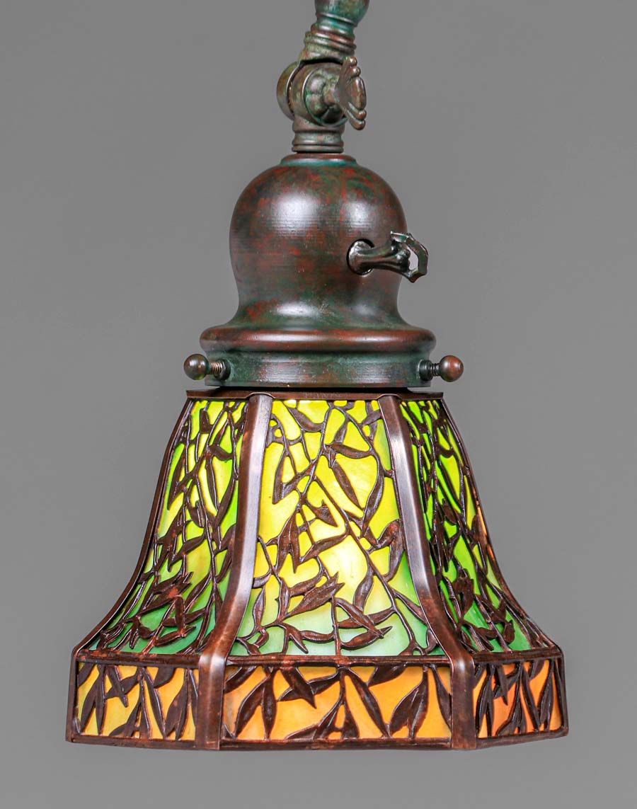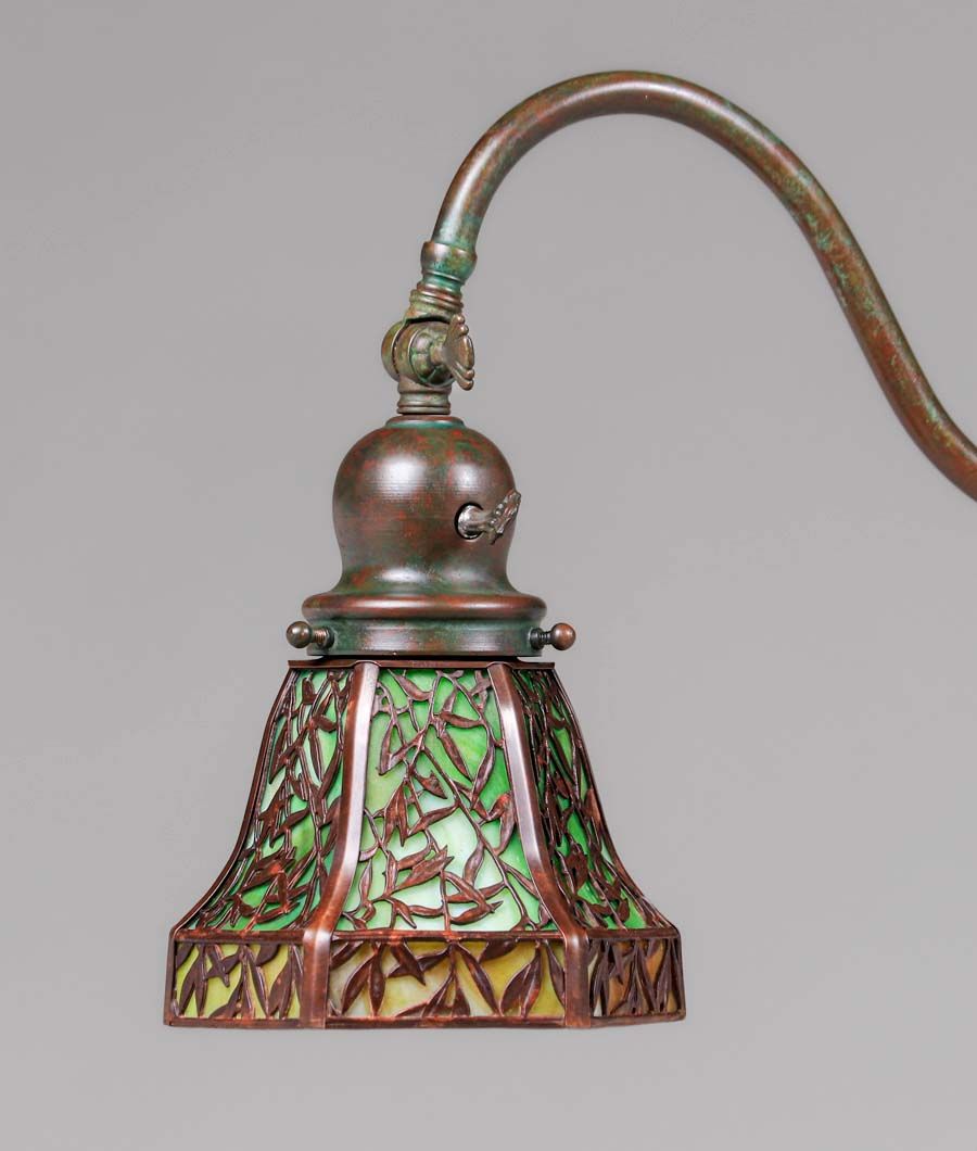 Handel Bamboo Leaf Overlay Adjustable Floor Lamp c1910. Signed. Excellent original patina. Original glass in perfect condition. 50.75"h x 17" depth x 8"d base SOLD
