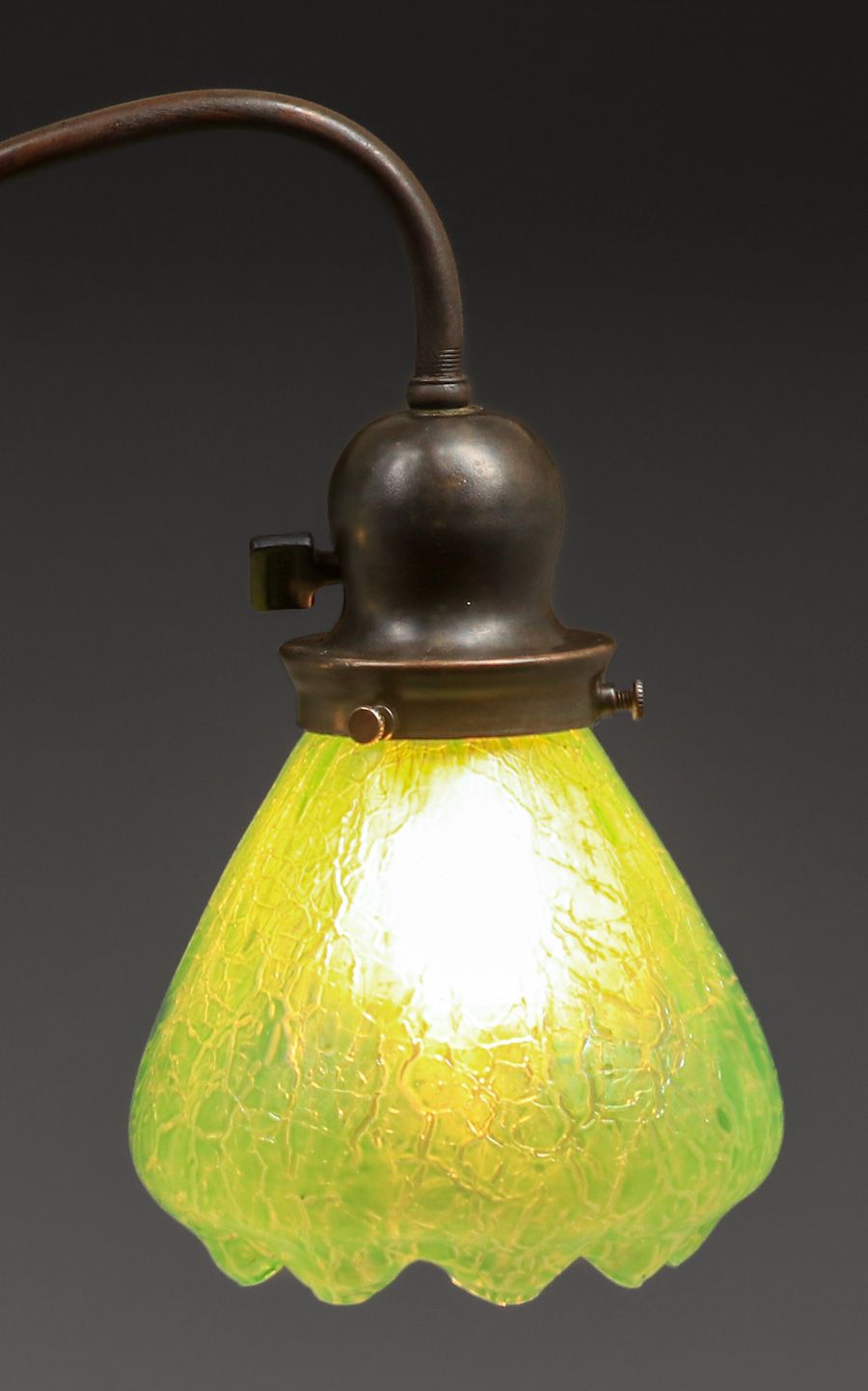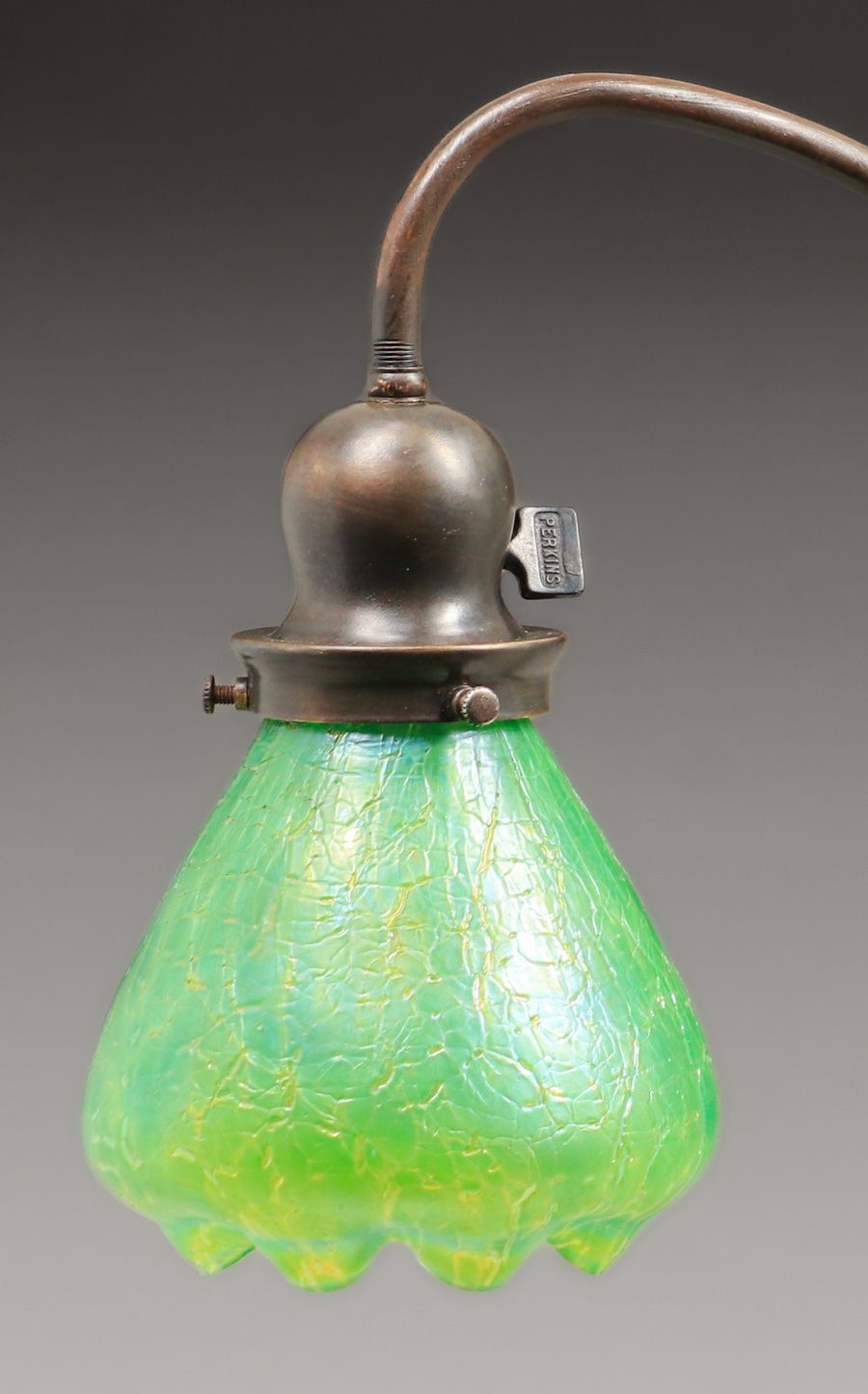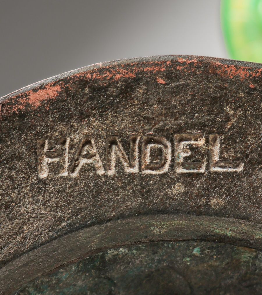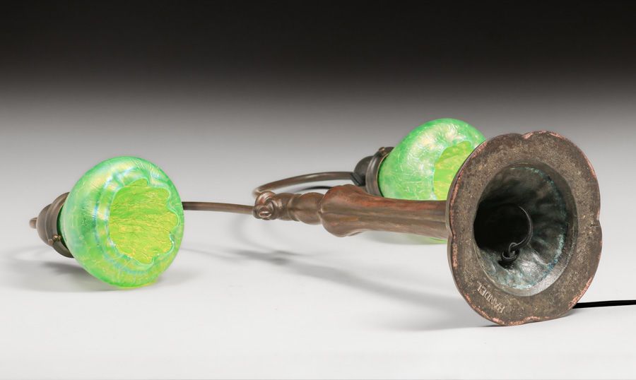 Handel Double Bridge Lamp c1910. Signed. Excellent new patina. Period glass shades in perfect condition. 24″h x 21.25″w x 7.5″d base SOLD