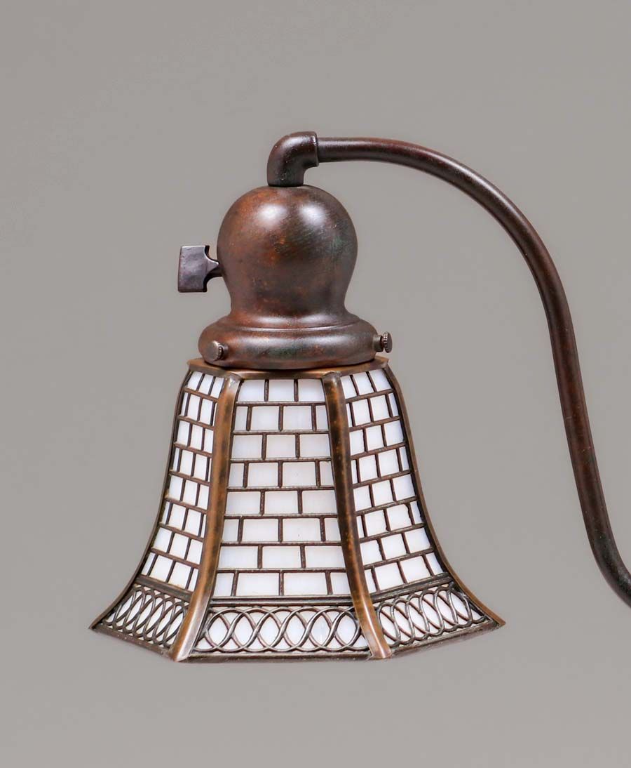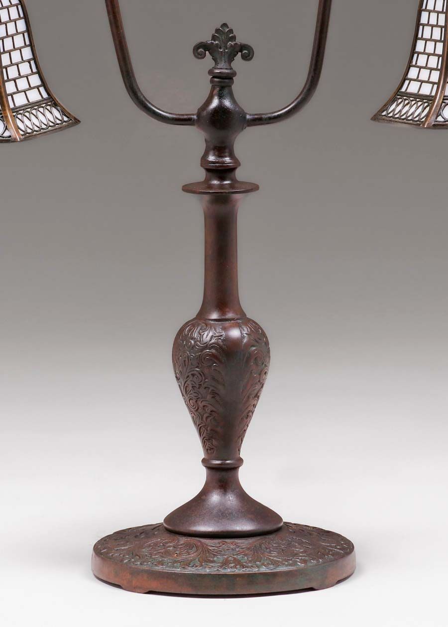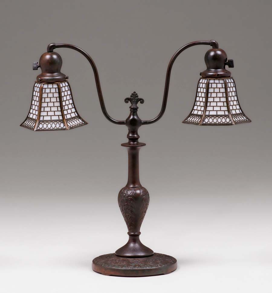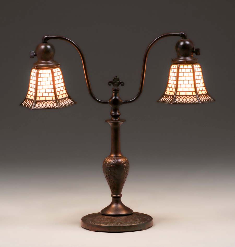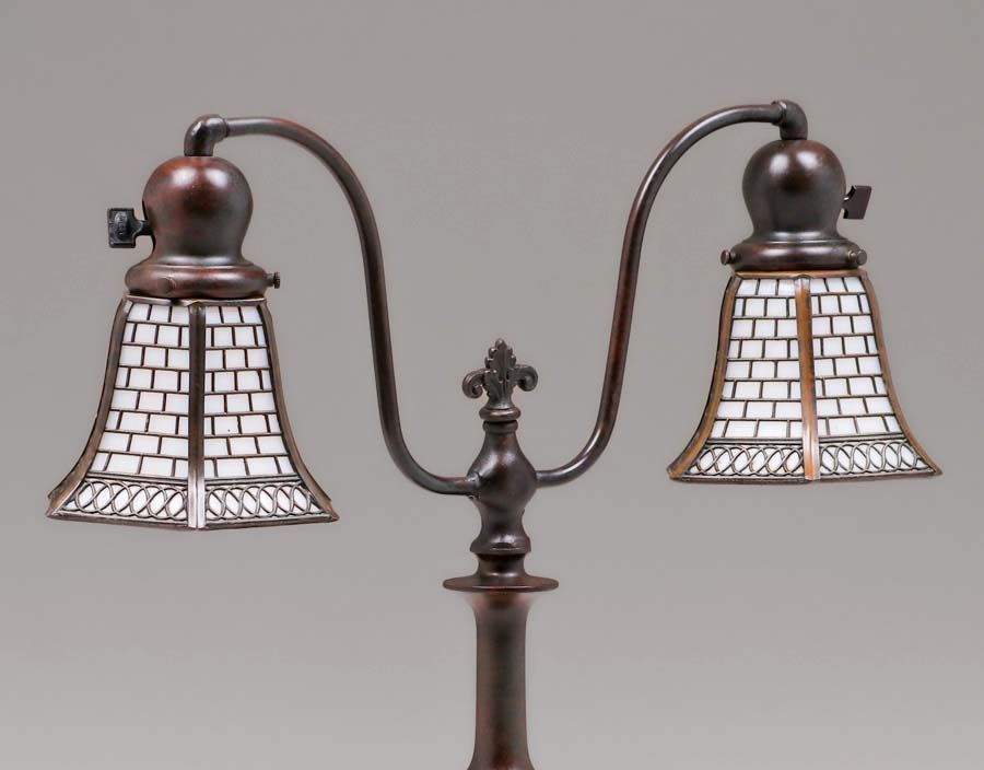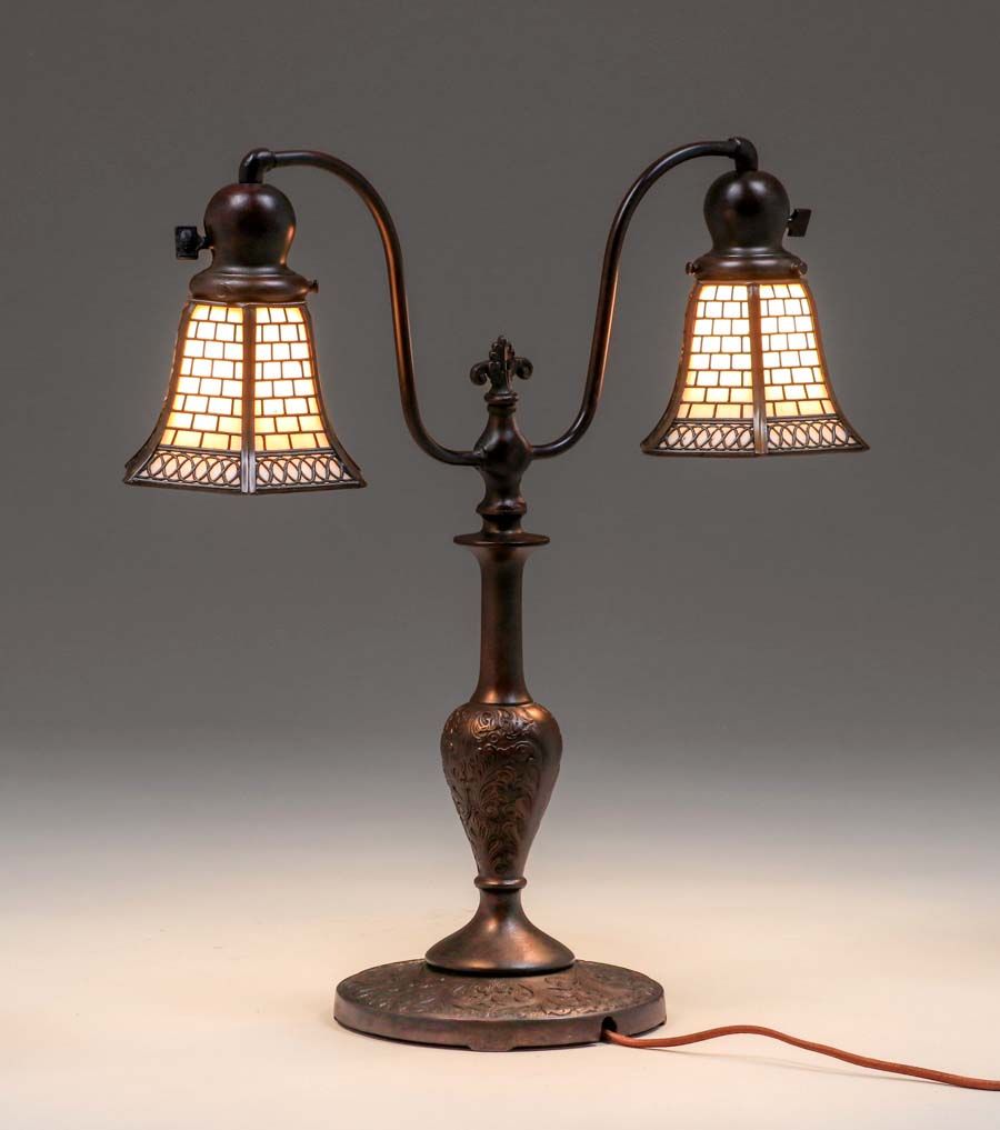 Handel Double Bridge Table Lamp c1910s. Signed. Excellent new patina. Original glass in perfect condition. 20.5”h x 20.75”w