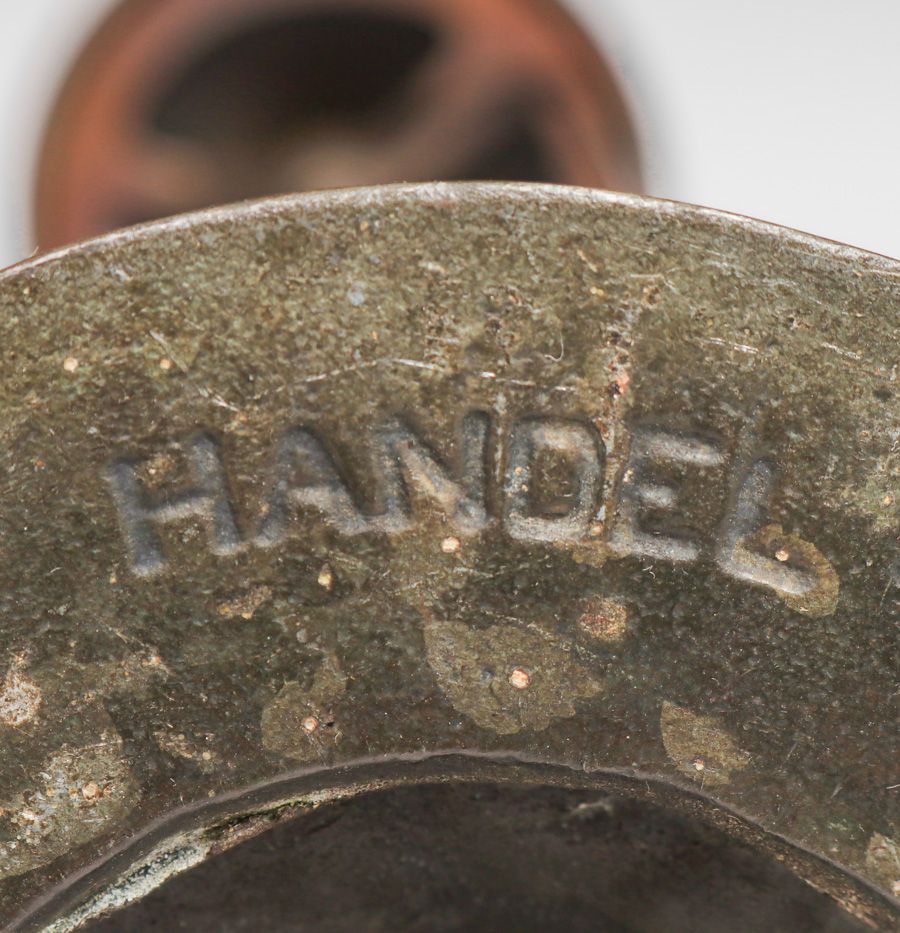Handel Green Leaded Glass Boudoir Lamp c1910. Signed. Excellent original patina. A few tight line to original glass. 16"h x 10"h $3800