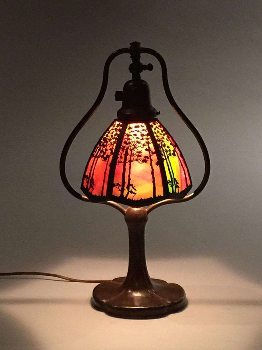Handel overlay shade desk lamp. Unsigned. Original patina. 17.75"h x 9.5"w SOLD