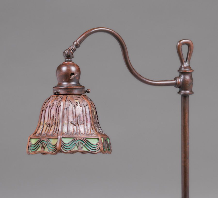 Handel Palm Tree Overlay Diminutive Floor Lamp c1910. Signed. Color added to original patina. 50"h as shown (adjustable) x 16" depth x 7"d base SOLD