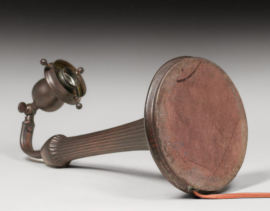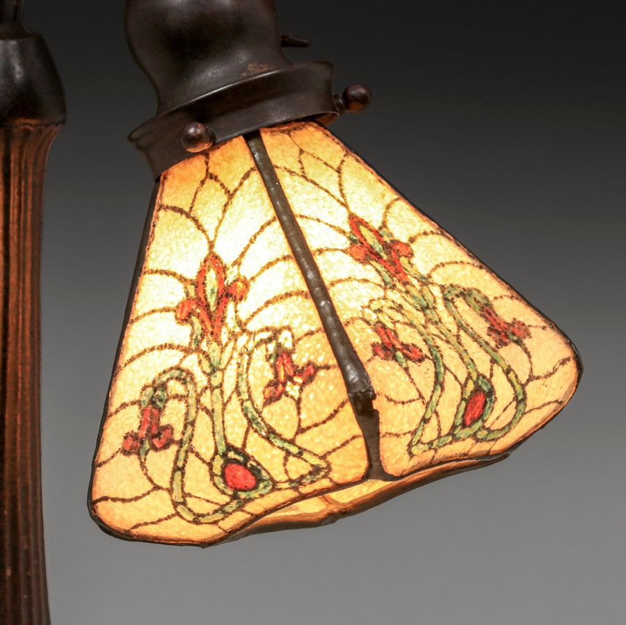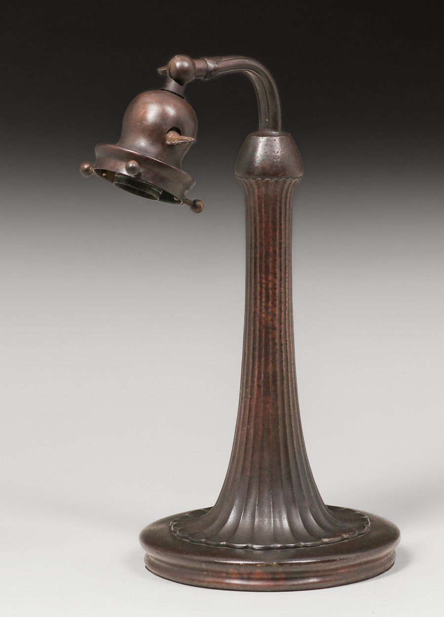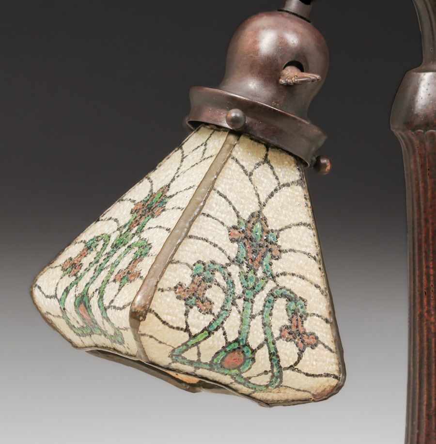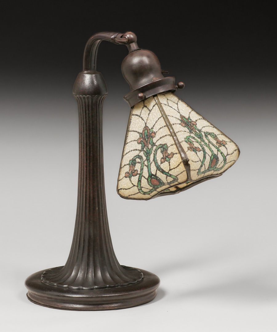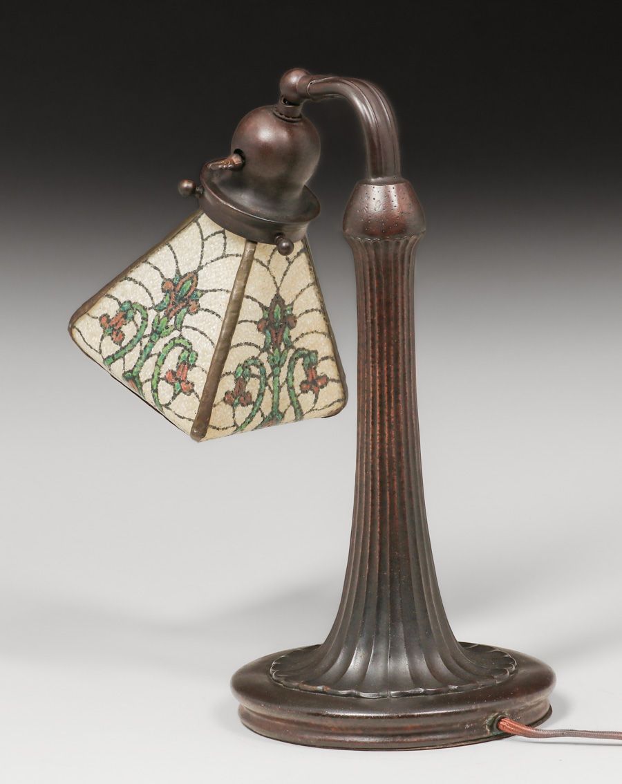 Handel Reverse Painted Desk Lamp c1910. Base signed. Color added to original patina. 14"h x 11" x 6.5"d base. Shade 4.5" x 4.5" SOLD