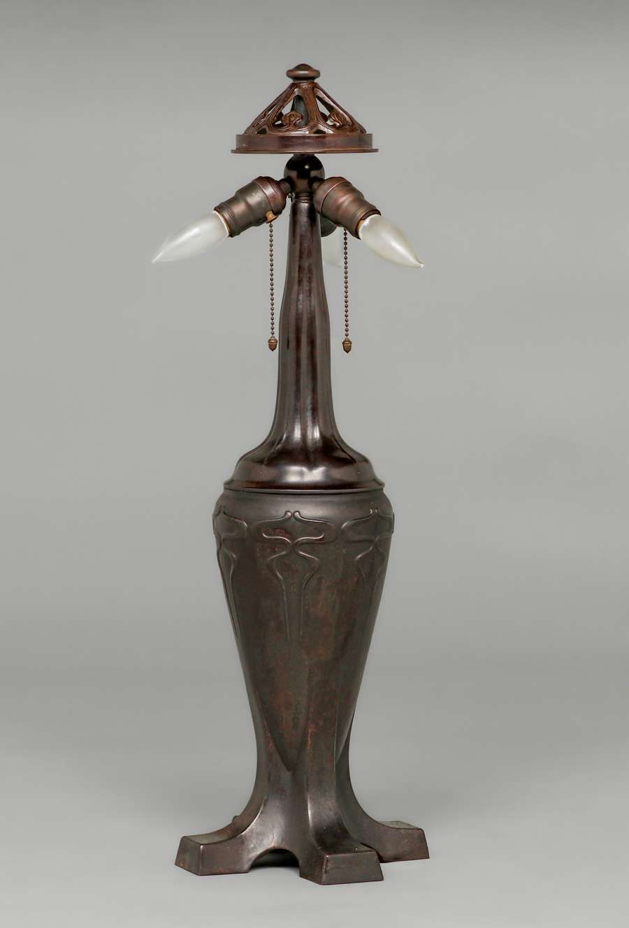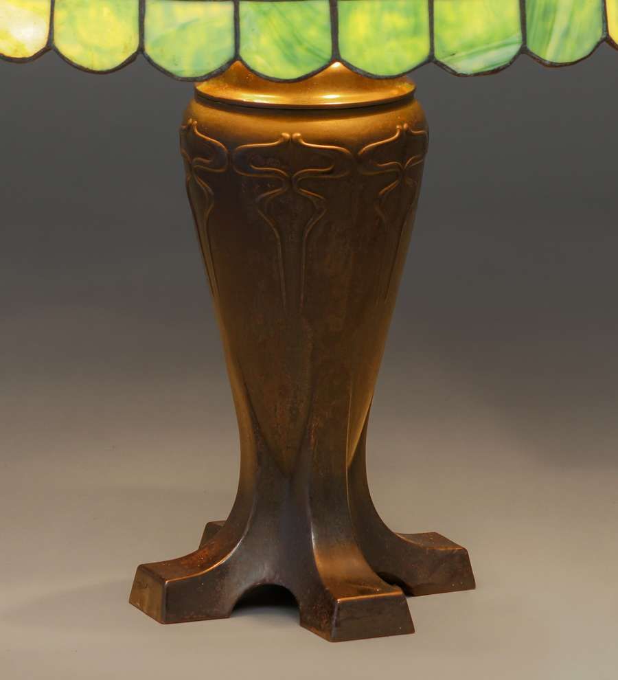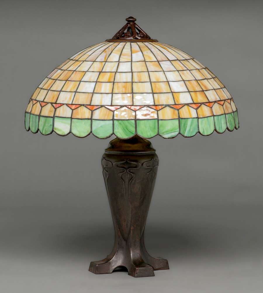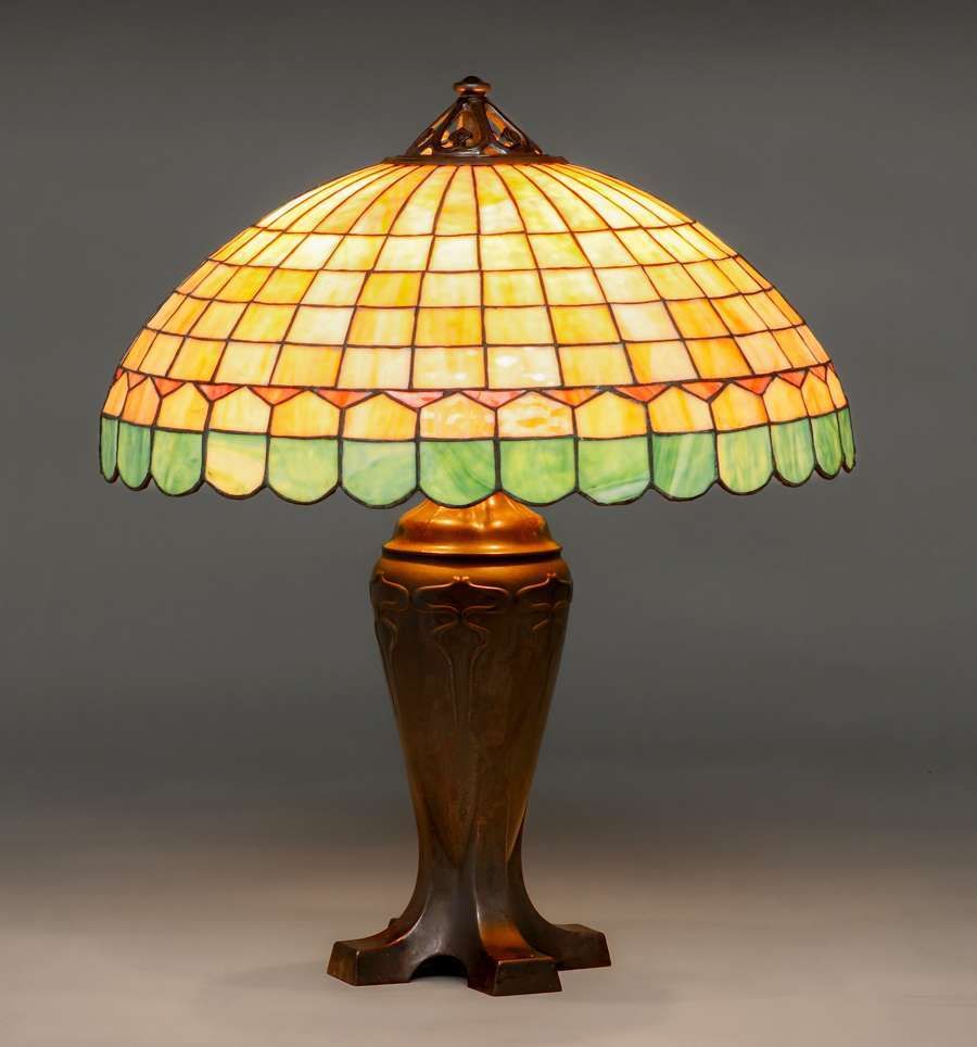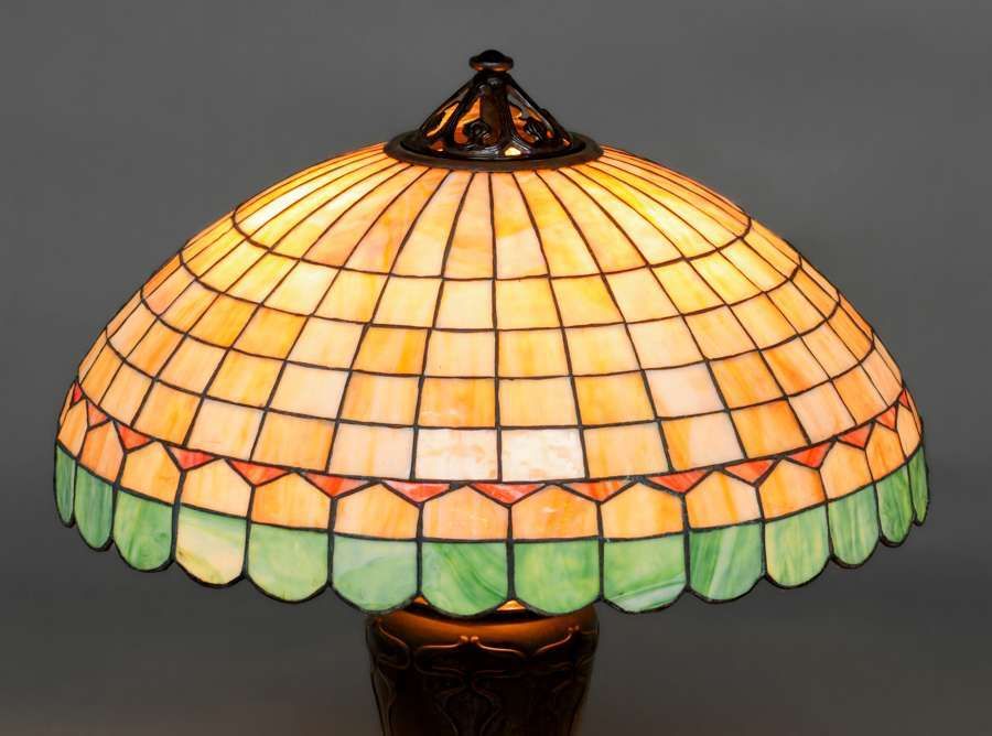 Large Handel Leaded Glass Lamp c1910. Signed. Excellent original patina. A couple of minor cracks to leaded glass. Excellent condition. 28.5"h x 23.5"d SOLD