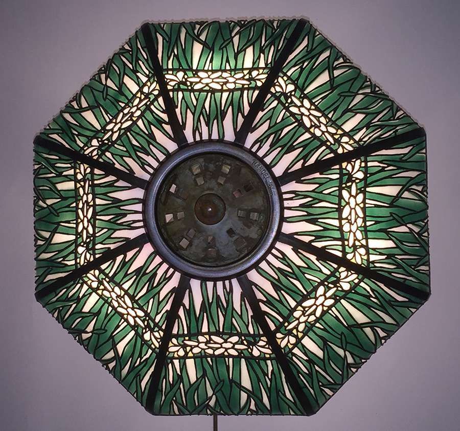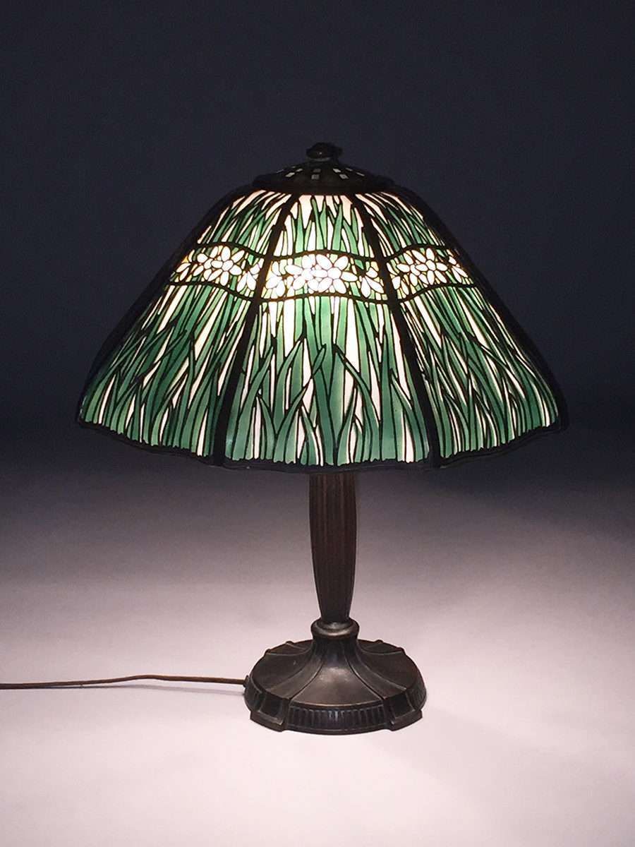 Rare Handel "Paperwhite" overlay lamp. Signed on shade and base. Excellent original patina. 20"h x 16"d SOLD