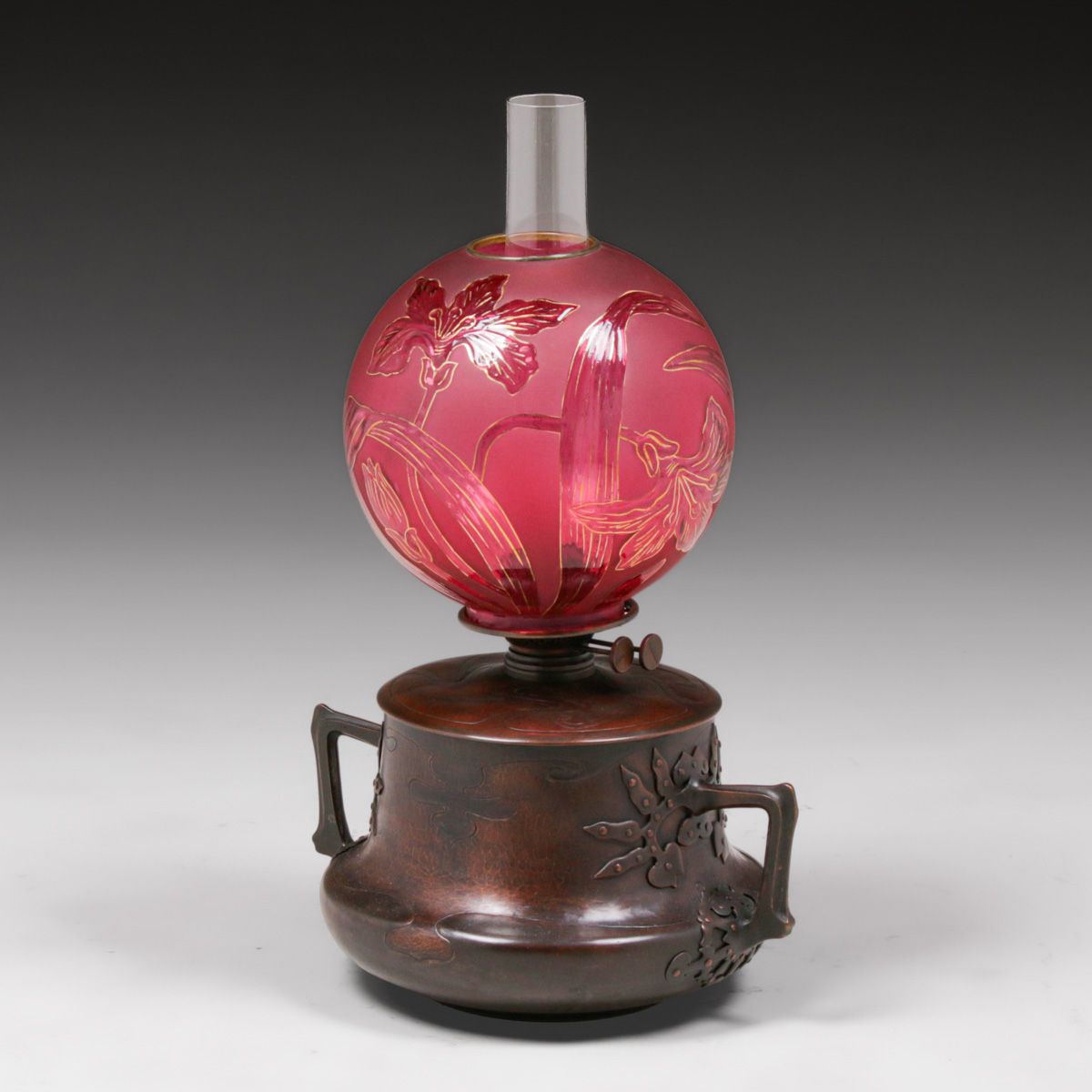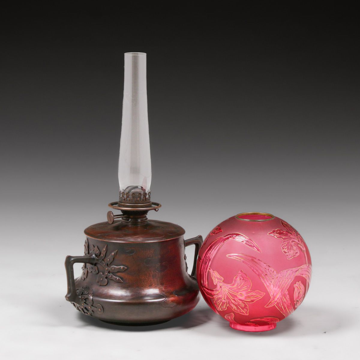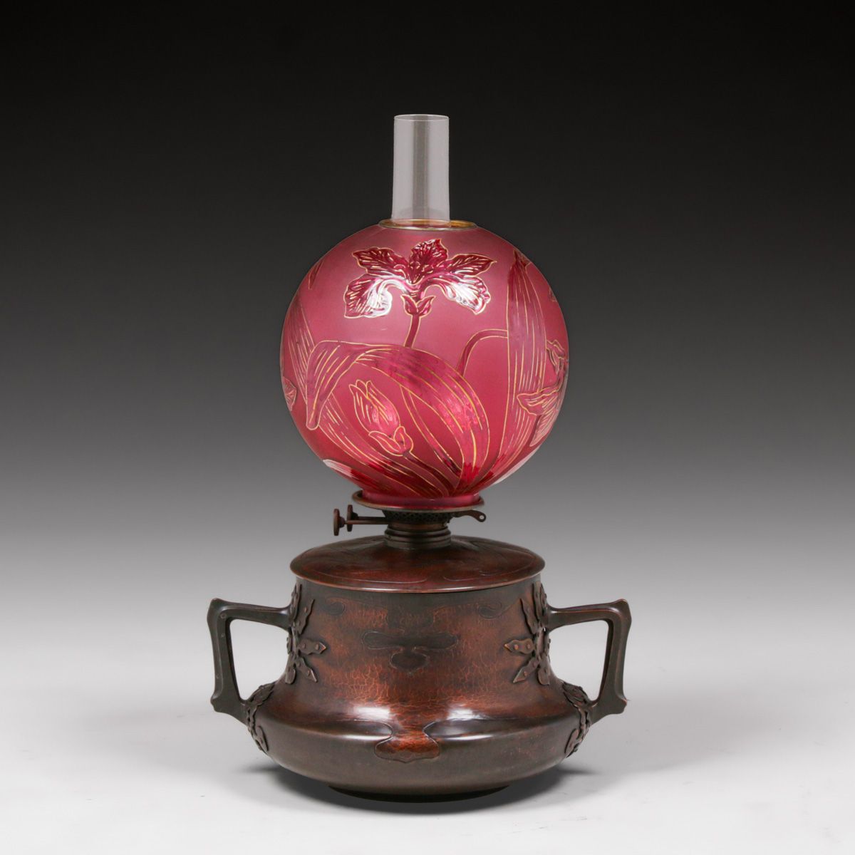 Hans Eduard von Berlepsche-Valendas - Munich, Germany Secessionist Hammered Copper & Brass Kerosene Lamp c1898-1900. <em>This lamp represents the earliest of the good Munich Secessionist Design. </em>Unsigned. Excellent new patina. Etched glass shade in perfect condition. 23"h with glass chimney x 14.5"w. Base 8"h x 14.5"w. Glass shade 8.5"d