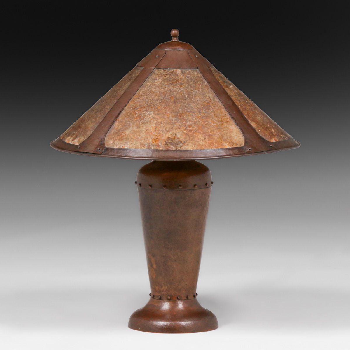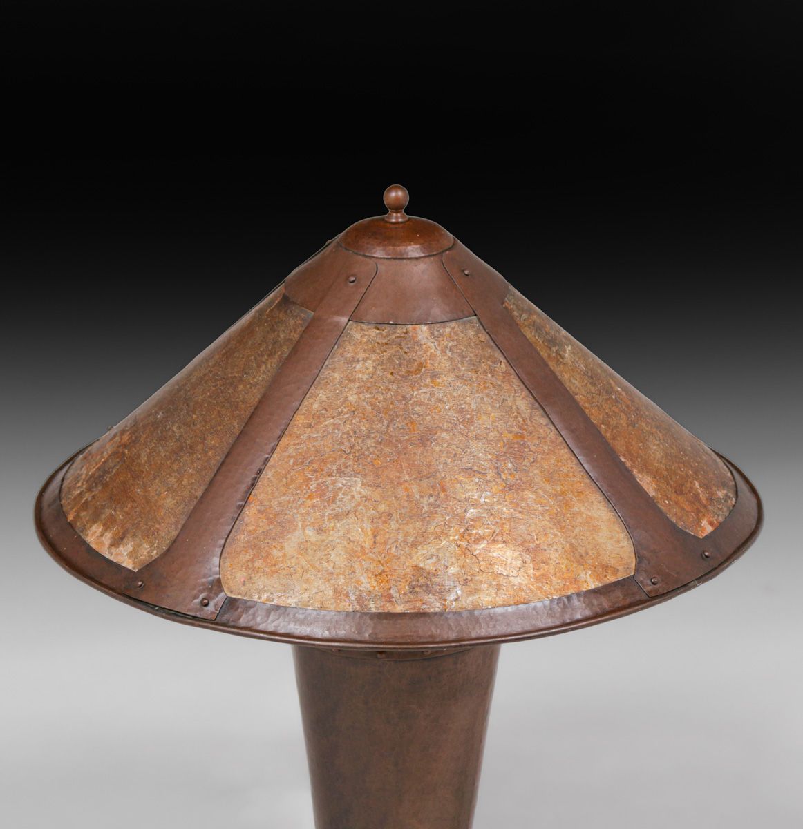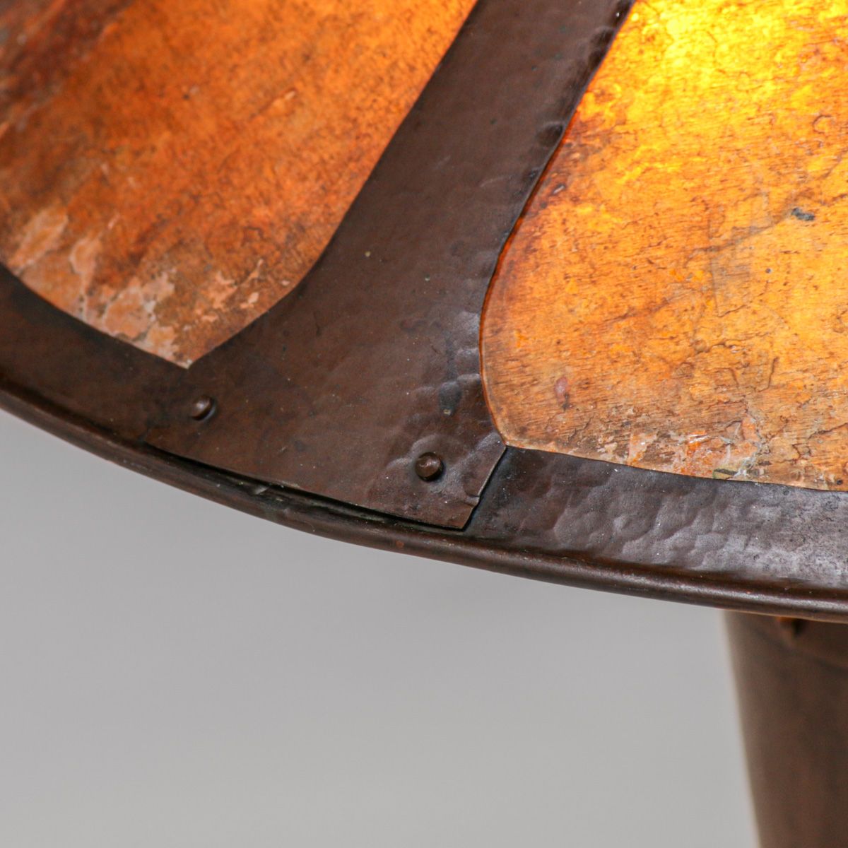 John L. Willocx (not Willcox) Hammered Copper & Mica Riveted Lamp c1920s. Unsigned. Excellent original patina and original mica. For a similar example see Bay Area Copper 1900-1950, Dirk van Erp & His Influence , page 106, figure 275 and Front Cover of the book.