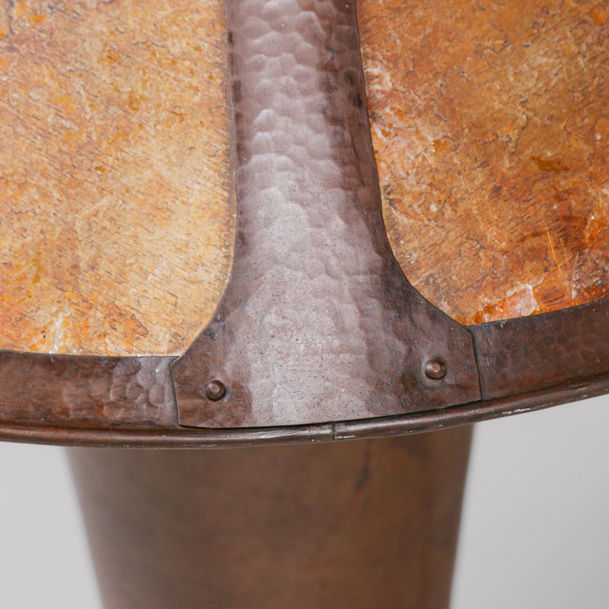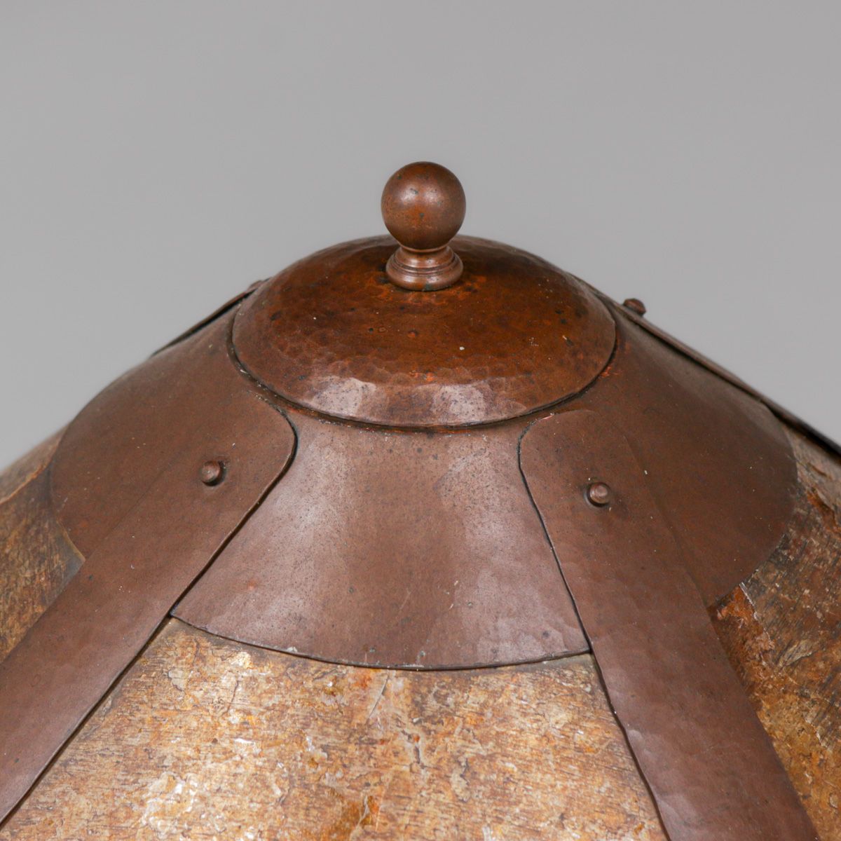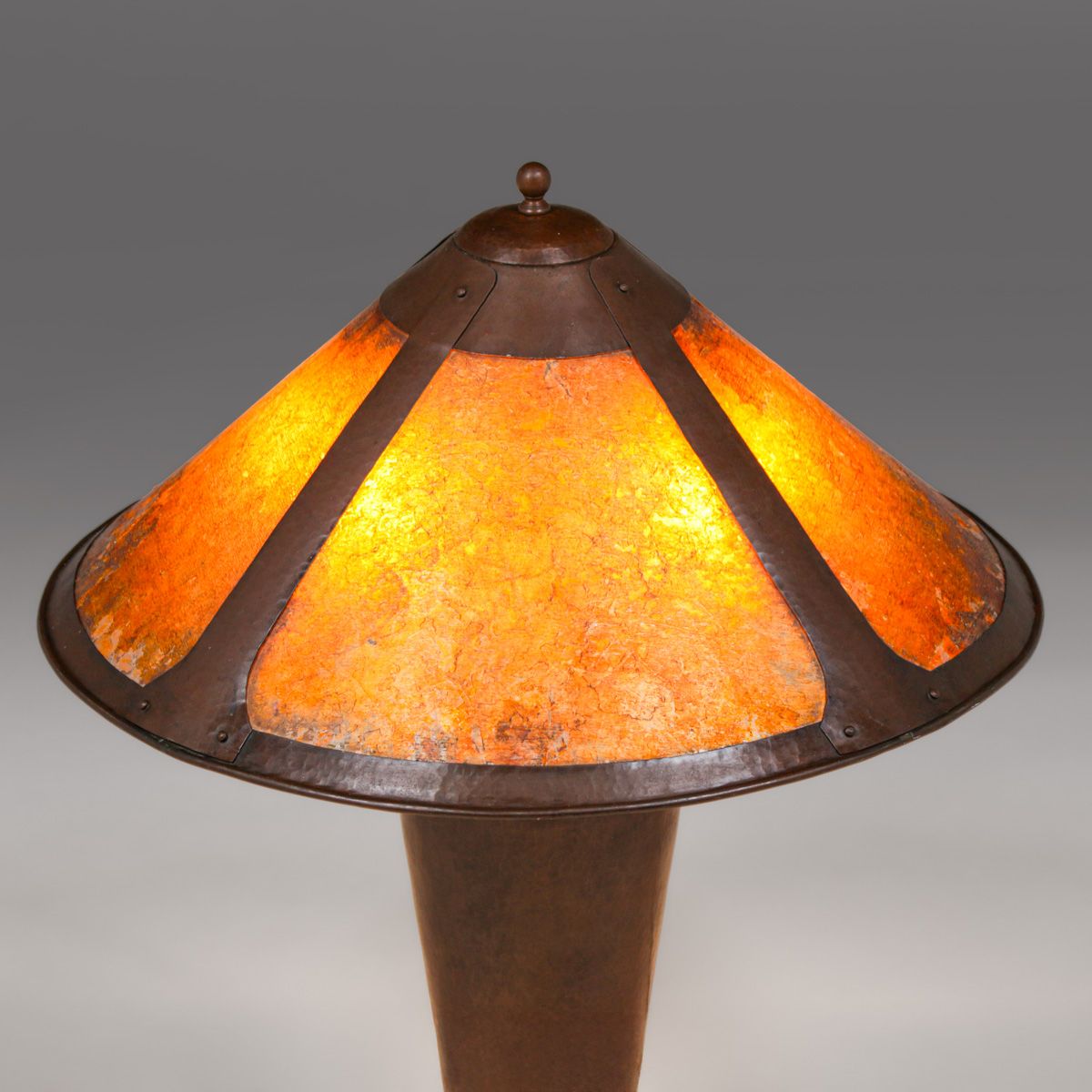 John L. Willocx (not Willcox) Hammered Copper & Mica Riveted Lamp c1920s. Unsigned. Excellent original patina and original mica. For a similar example see Bay Area Copper 1900-1950, Dirk van Erp & His Influence , page 106, figure 275 and Front Cover of the book.