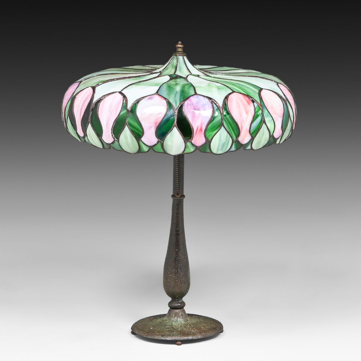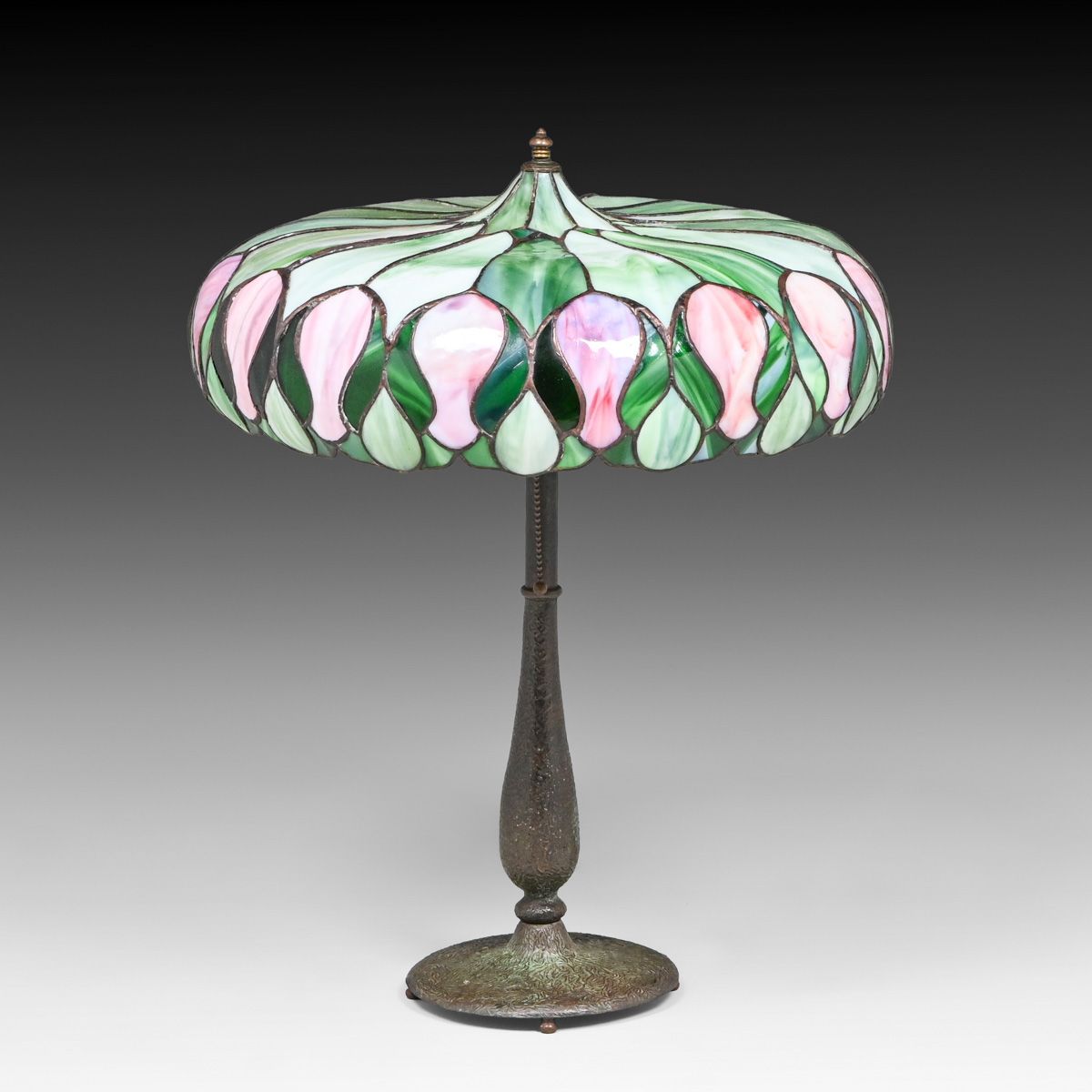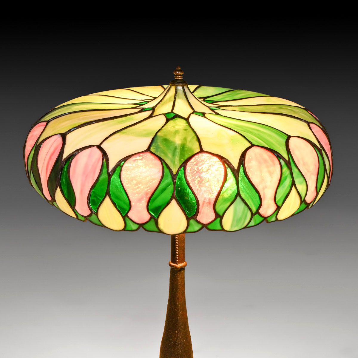 John Morgan & Sons Green & Red Leaded Glass Lamp c1910. Unsigned. A few tight lines to original leaded glass. Overall excellent condition. Excellent original patina. 24"h x 21"d