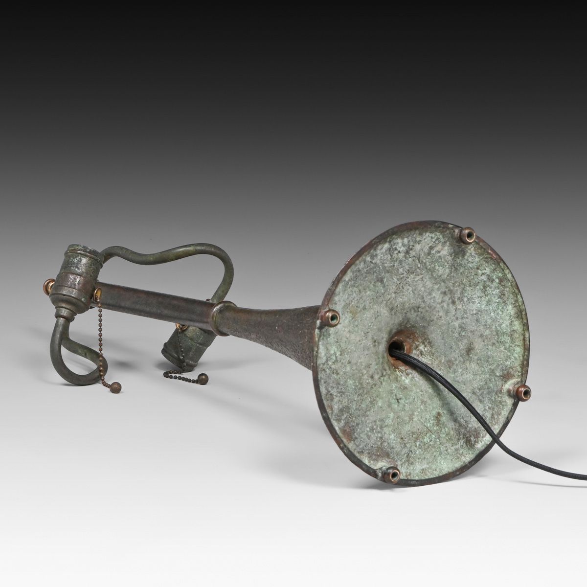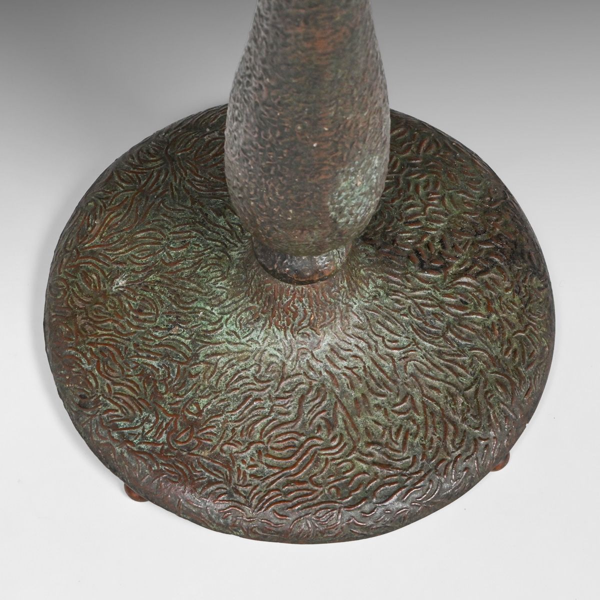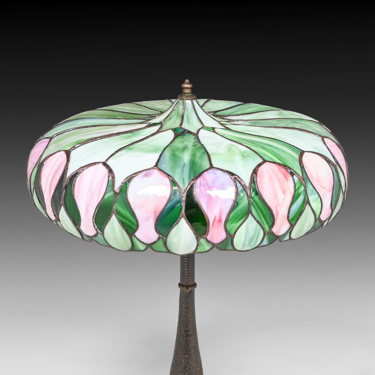 John Morgan & Sons Green & Red Leaded Glass Lamp c1910. Unsigned. A few tight lines to original leaded glass. Overall excellent condition. Excellent original patina. 24"h x 21"d