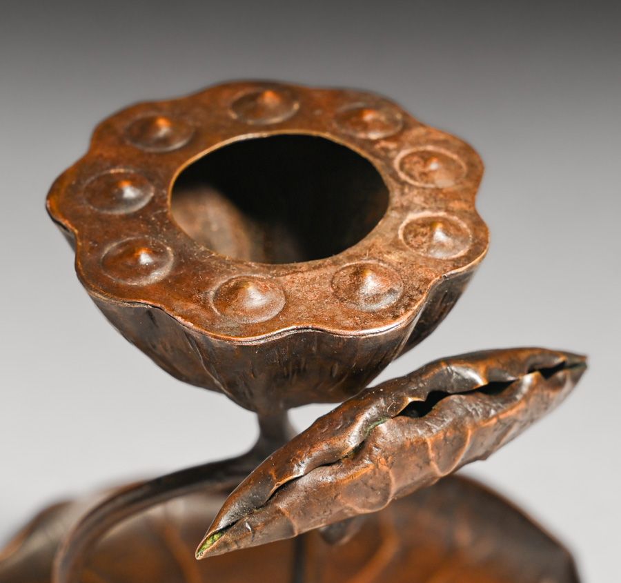 Leonide Lavaron – Chicago Copper Candlestick c1905-1910. Lavaron was inspired by and seems to have copied many designs and forms from Elizabeth Burton of Santa Barbara. Unsigned. Excellent new patina. 3.75"h x 4.5" x 4" SOLD