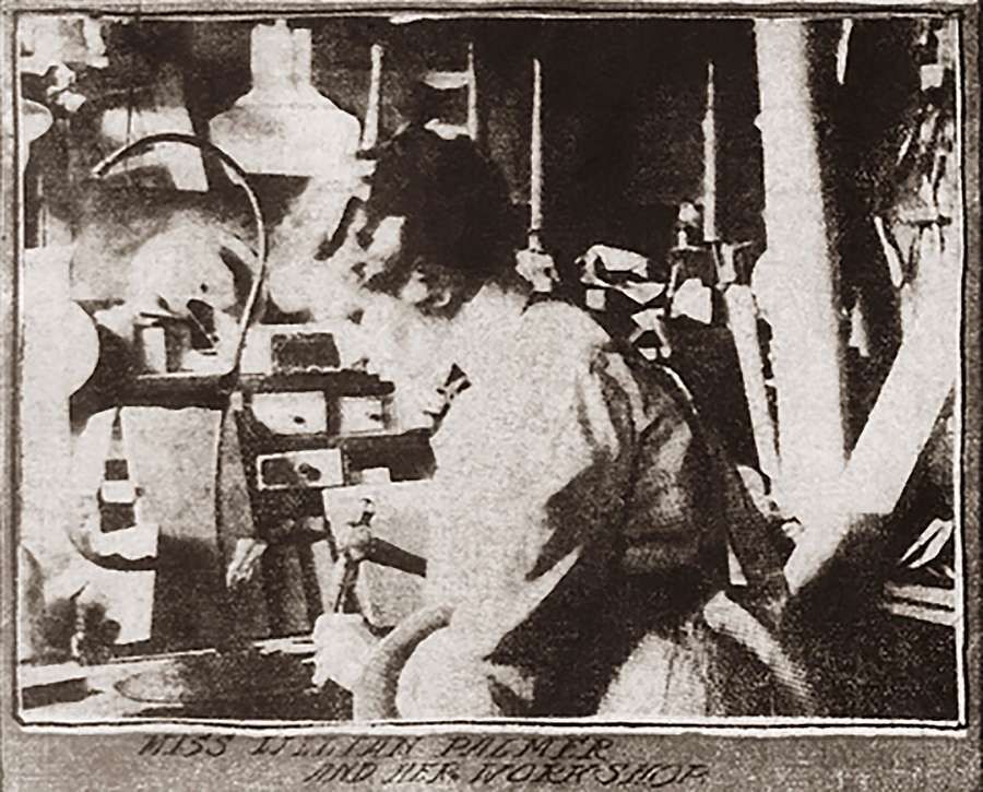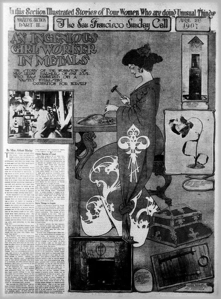 Lillian Palmer - San Jose, CA hammered copper lamp c1907. Unsigned. Almost identical lamp pictured in April 28, 1907 San Francisco Call article on Lillian Palmer and her workshop in her home in San Jose. She moved the business to San Francisco in 1910. 19"h x 17" x 8"d SOLD