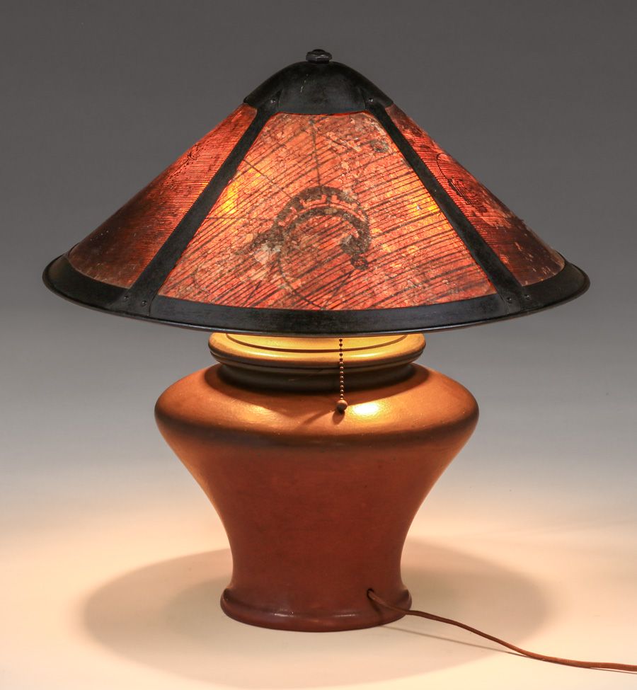 Lillian Palmer Copper & Stenciled Mica Lamp c1910s. Unsigned. Original pottery base probably Weller. Excellent original patina and original mica. Pottery base in perfect condition. 19"h x 18.5"d