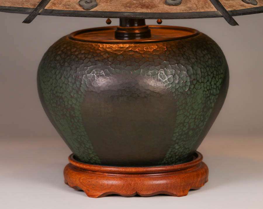 Lillian Palmer Lamp Harry S. Dixon Hammered Copper Base c1911-1916. Original patina & original mica. Unsigned. After being fired by Dirk van Erp in May 1911, Harry Dixon went to work for Lillian Palmer. This is a fantastic collaboration between the two of them. Exhibited Bay Area Copper, 1900-1950, Dirk van Erp & His Influence 2012. 24″h x 25″d SOLD
