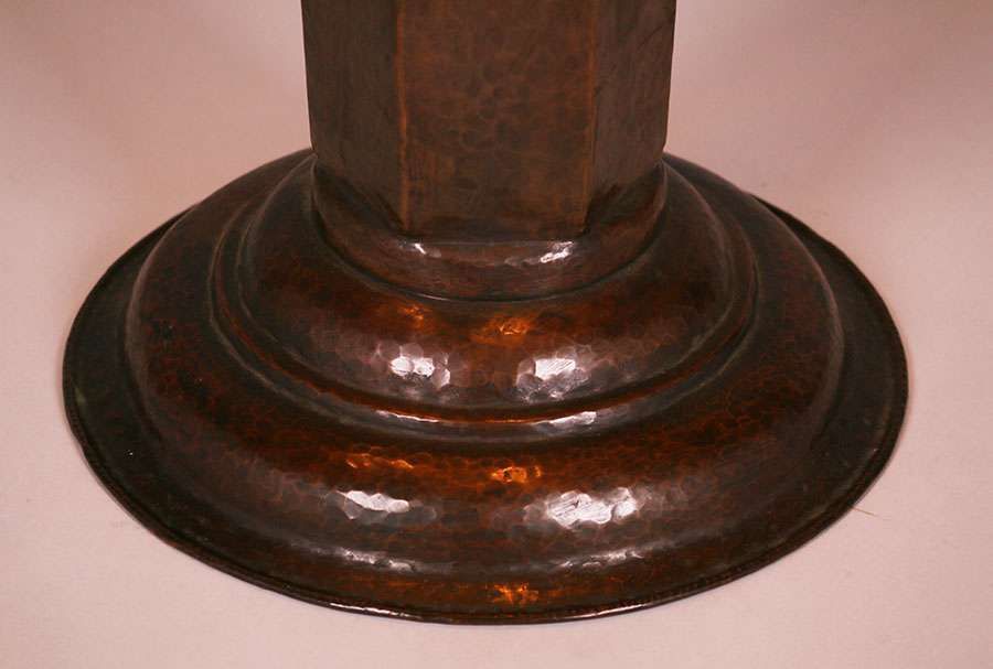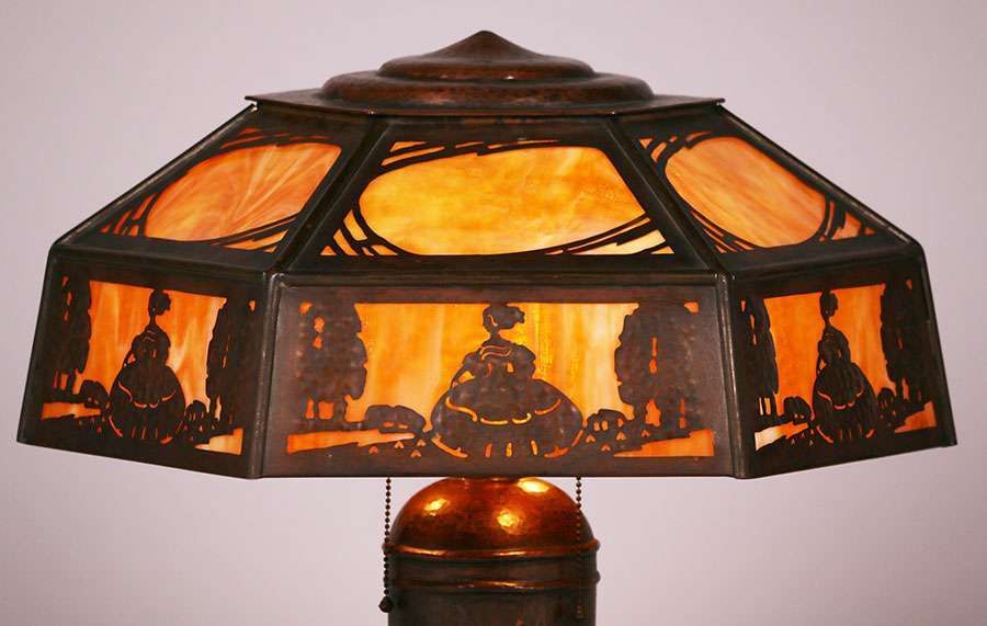 Limbert hammered copper and slag glass six-sided lamp with cutout silhouette Dutch girl motif. Unsigned. Excellent original patina. 25"h x 22.5"d SOLD