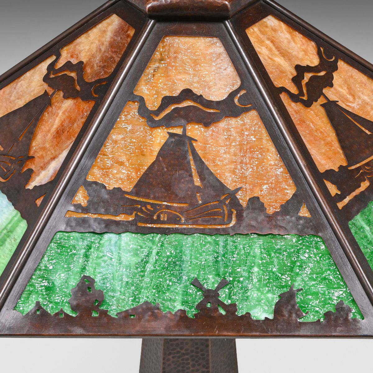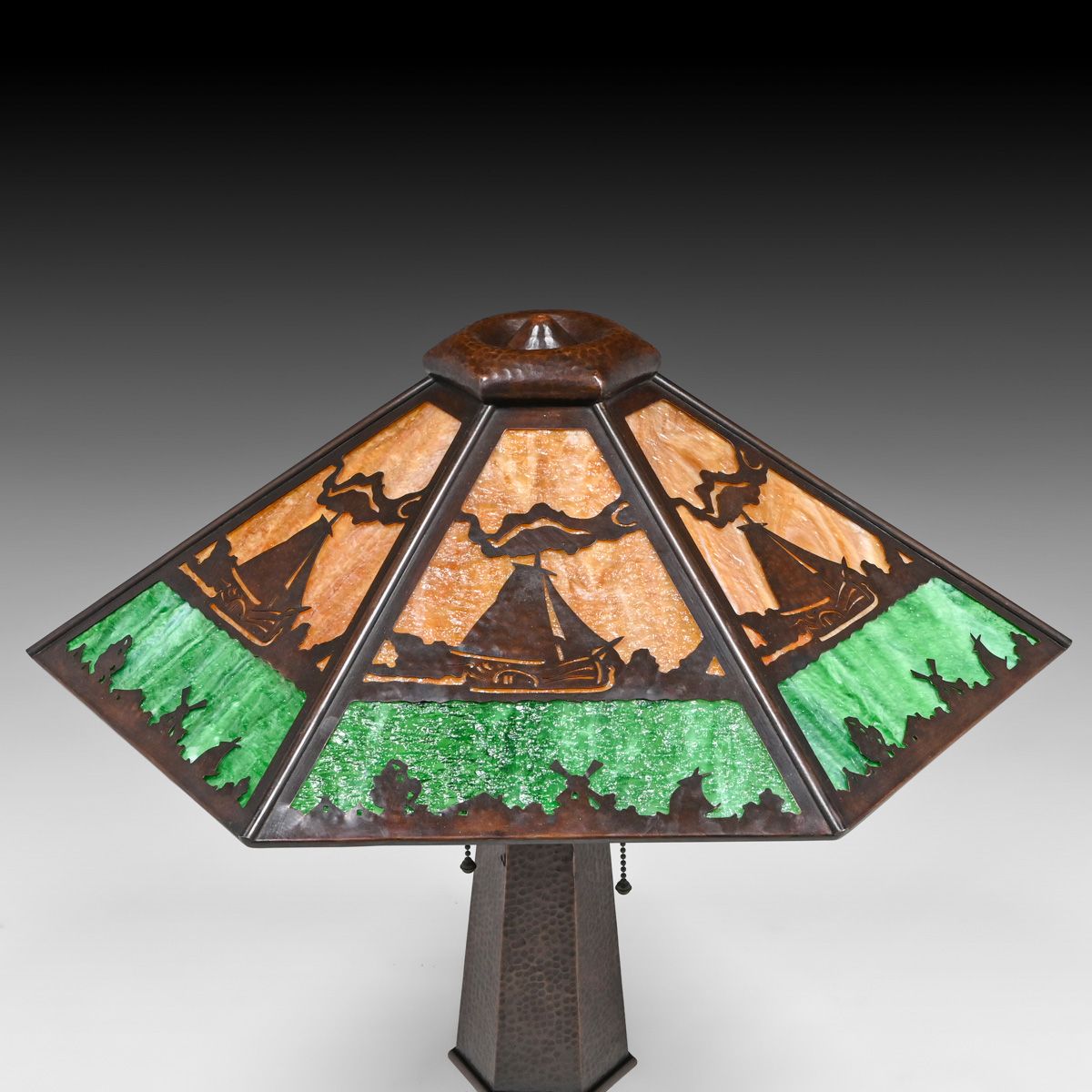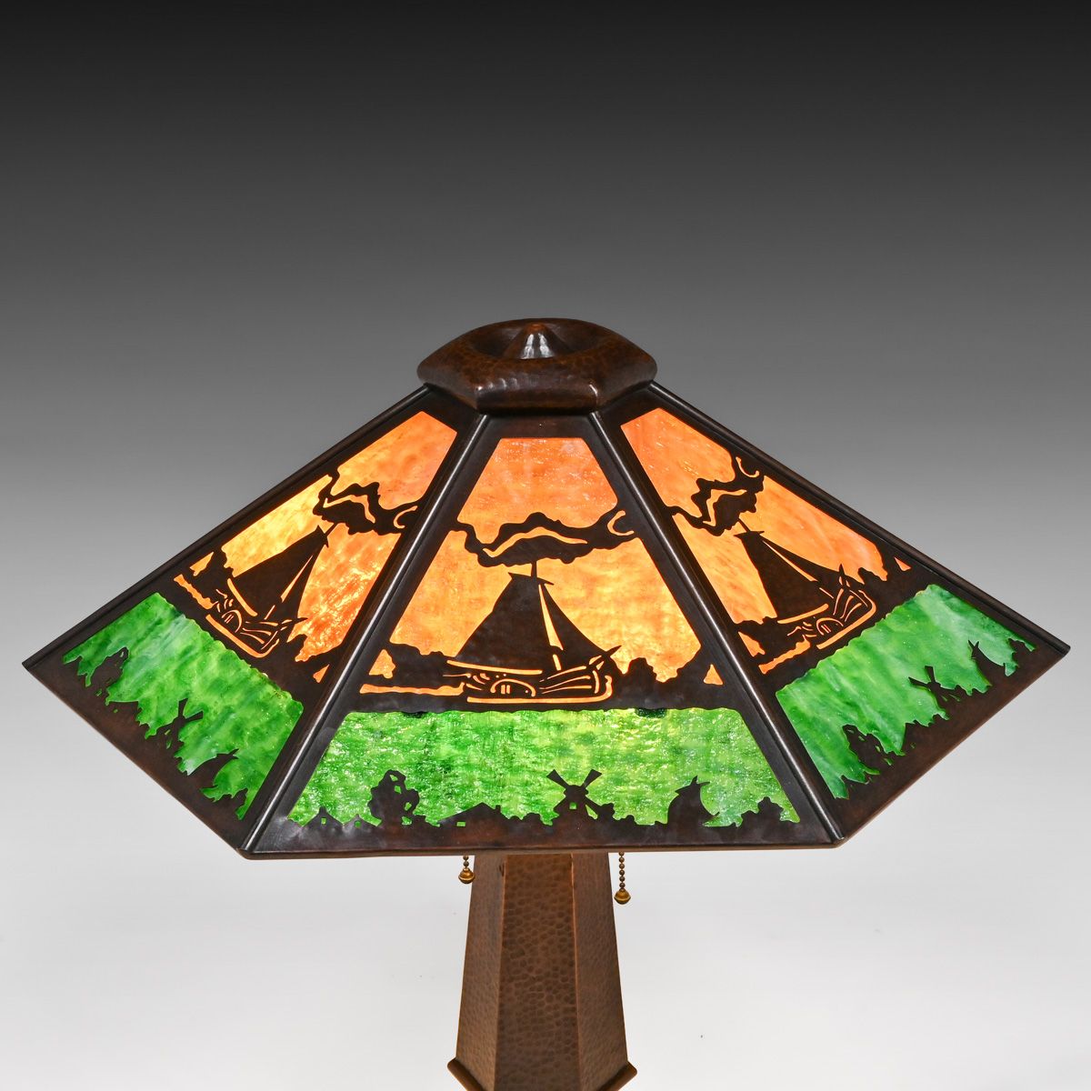 - Limbert Hammered Copper & Slag Glass Windmill Cutout Lamp c1910