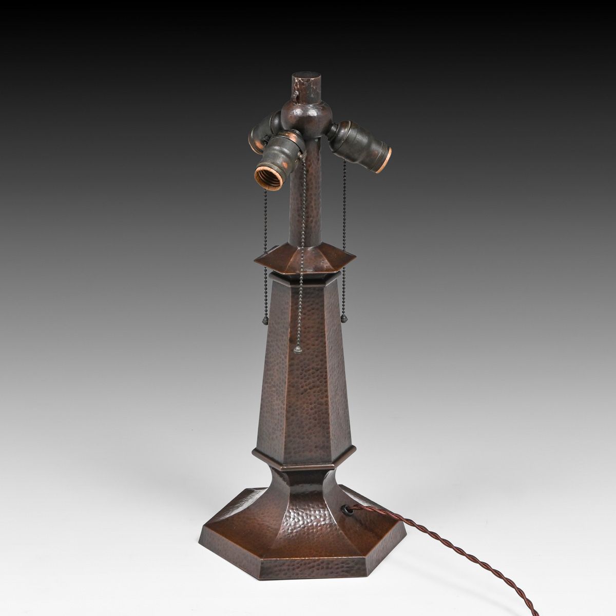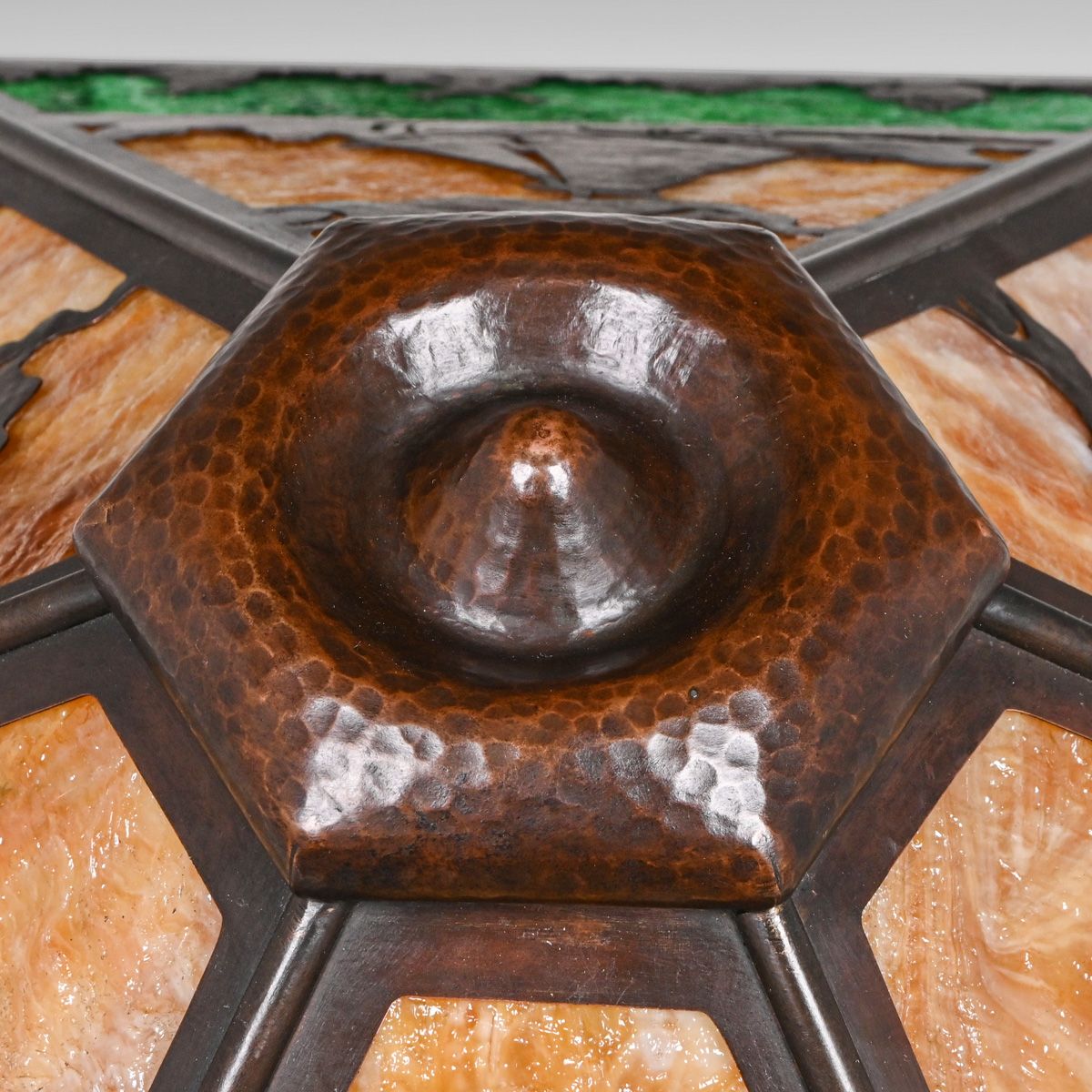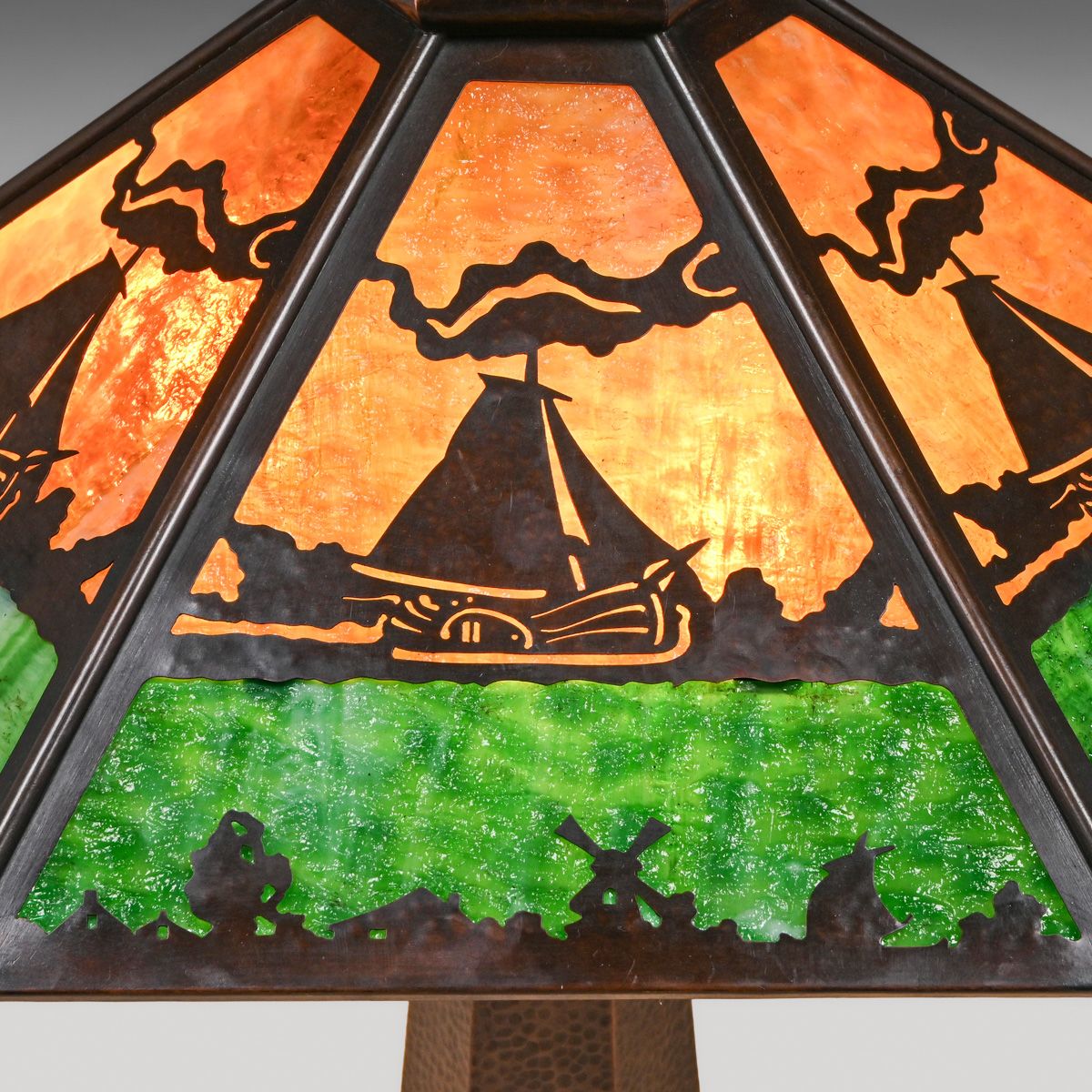 - Limbert Hammered Copper & Slag Glass Windmill Cutout Lamp c1910