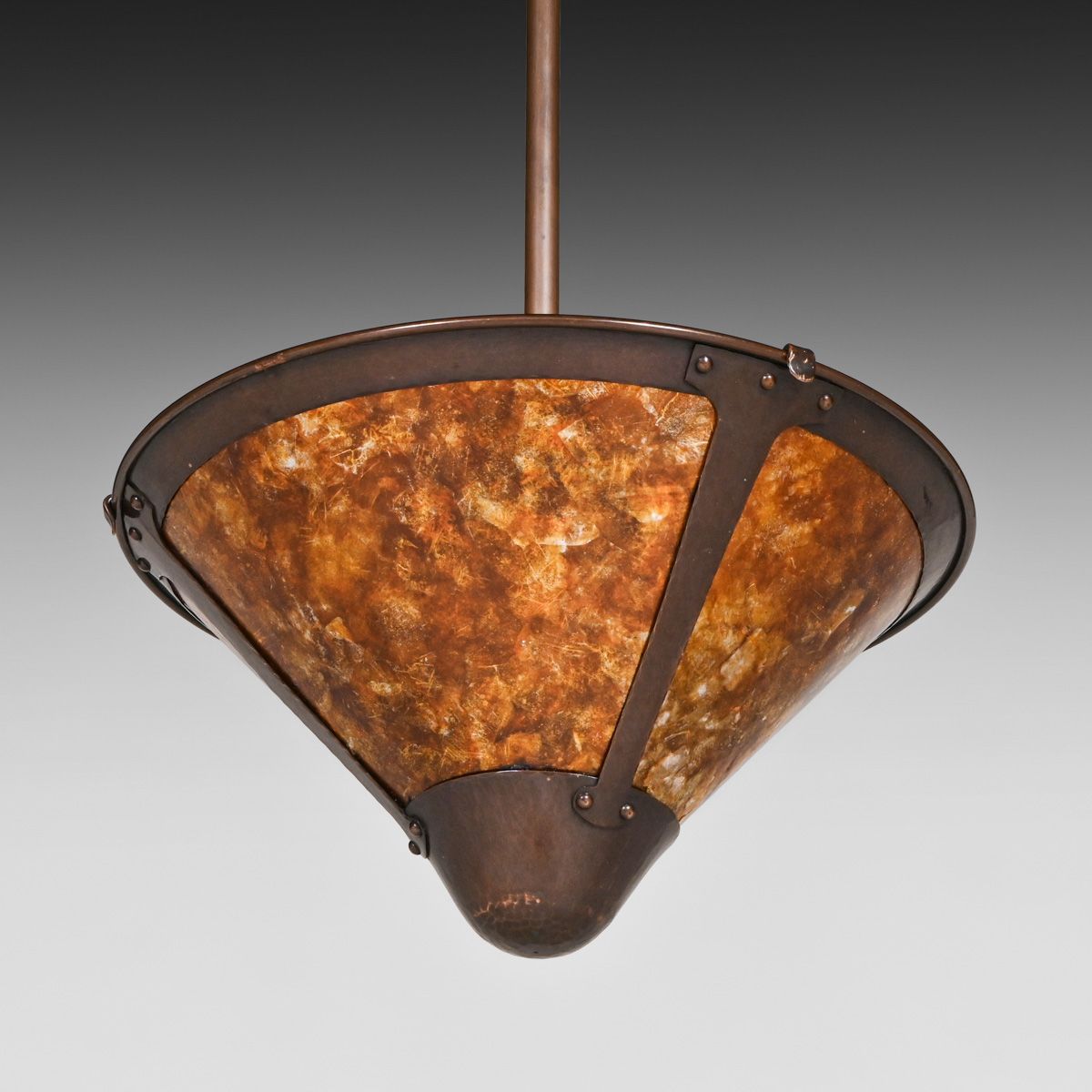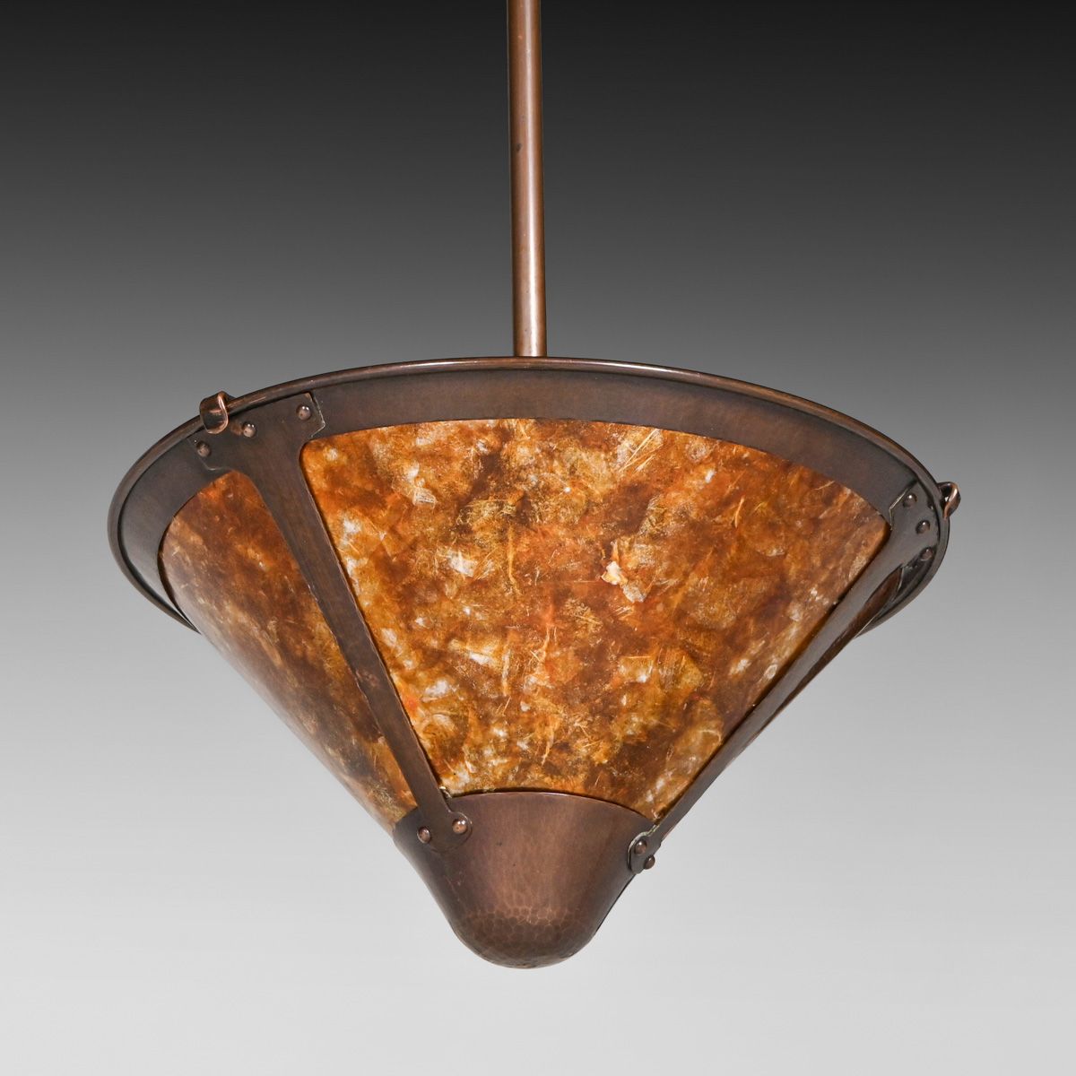 Michael Adams - Aurora Studios Set of 3 Hammered Copper & Mica Hanging Lights c2000. Unsigned. Excellent original patina and original mica. 56"h overall x 12"d