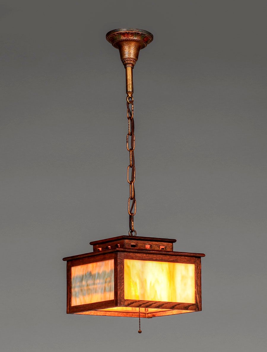 Peterson Art Furniture Co – Faribault, MN Oak & Slag Glass Prairie School Hanging Lamp c1910. This lamp shows the influence of Limbert motifs and design. Unsigned. Excellent original finish. Two of the four panels has original reverse-painted glass. 10.75" x 10.75" x 7.5"h (28"h overall) SOLD